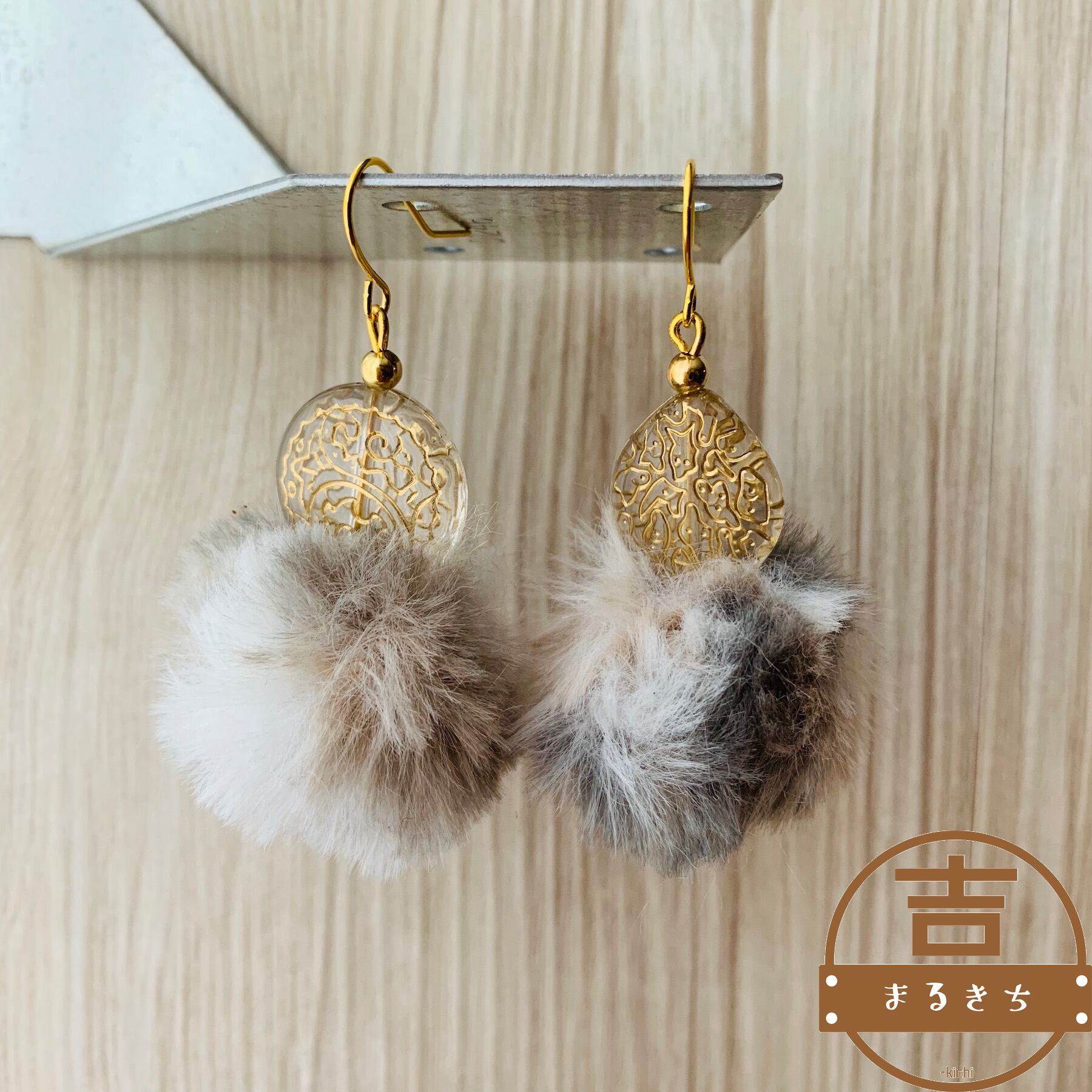 フェイクファーポンポンハンドメイドピアス◯アシメピアス◯アンティークビーズ