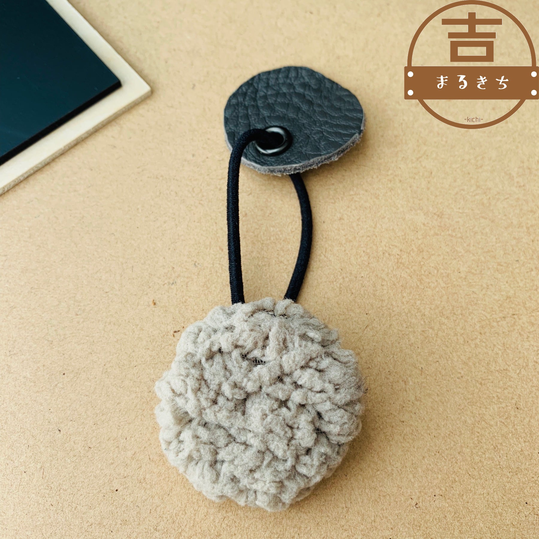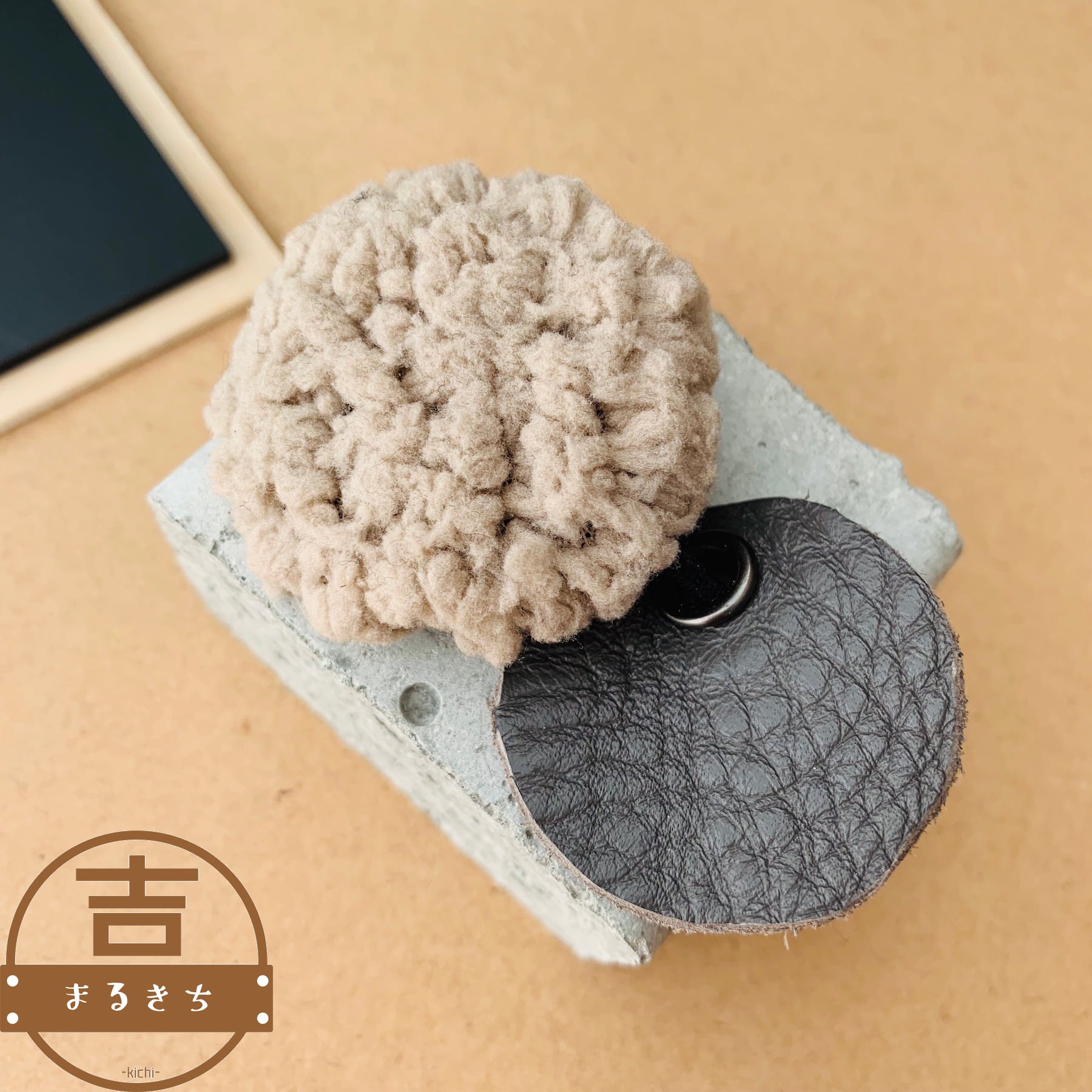 ふわふわボアでくるみボタンを包み、牛革レザータグを付けました。