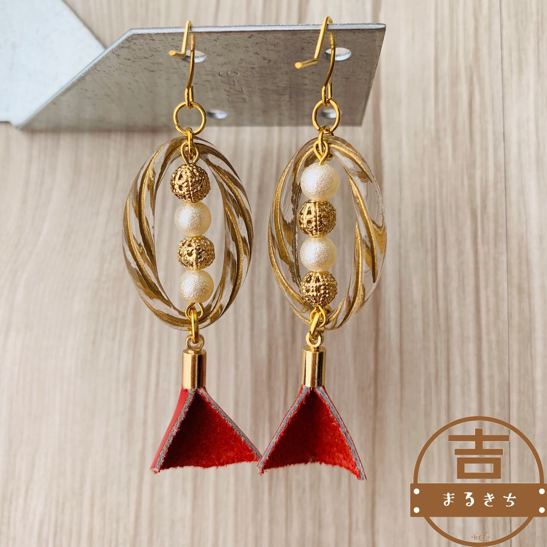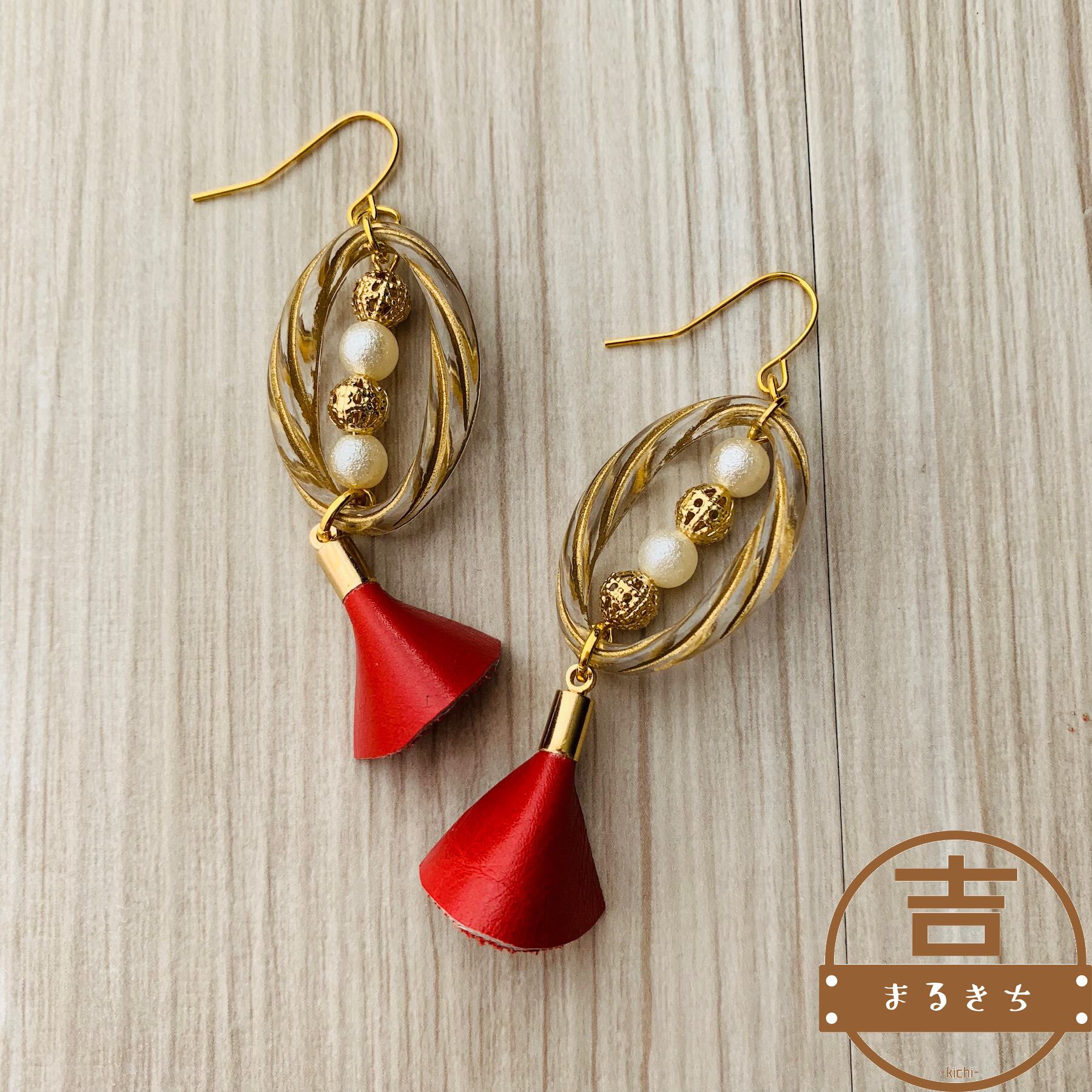 アンティークビーズとパールビーズ、レッドカラーの牛革レザーを使ったハンドメイドピアスです。