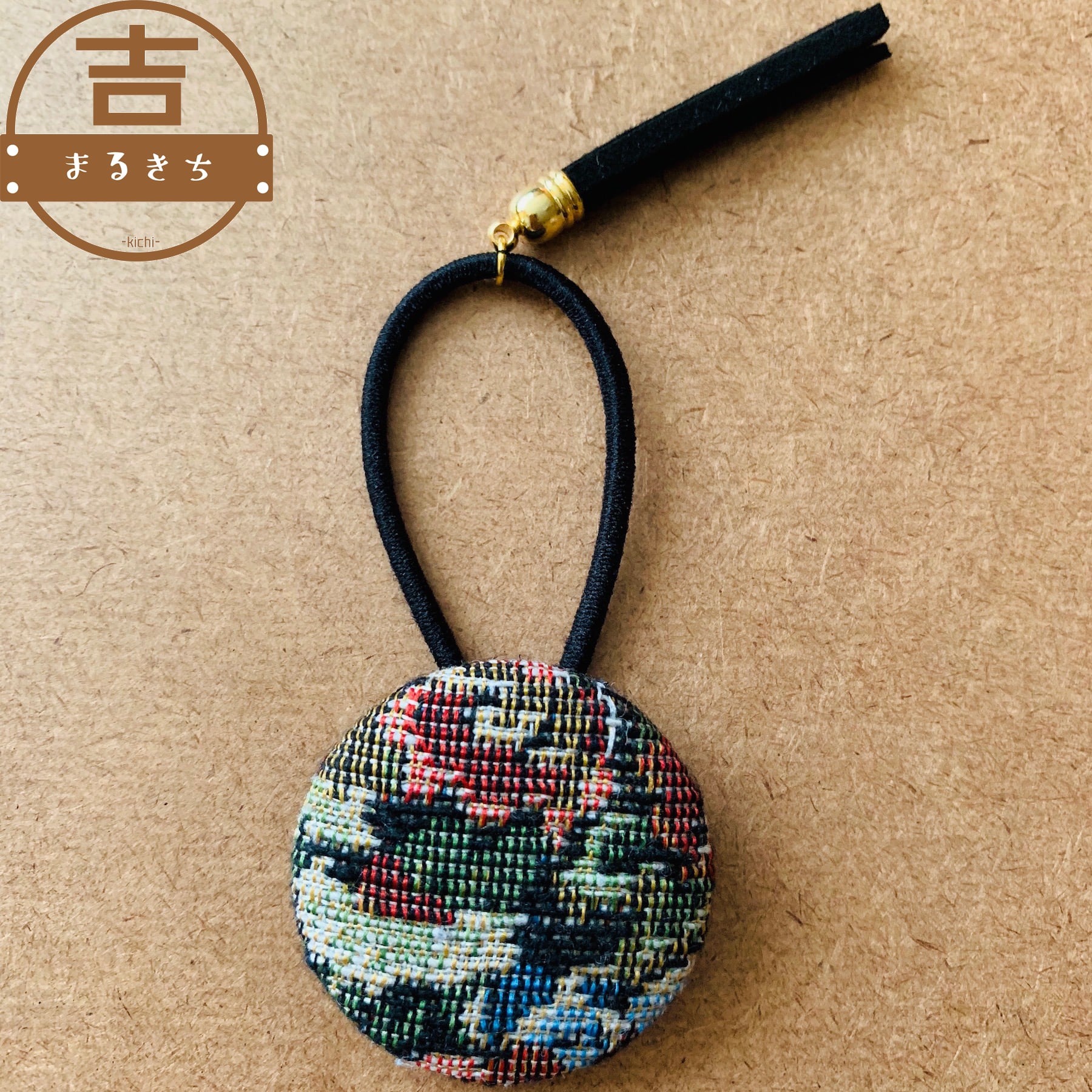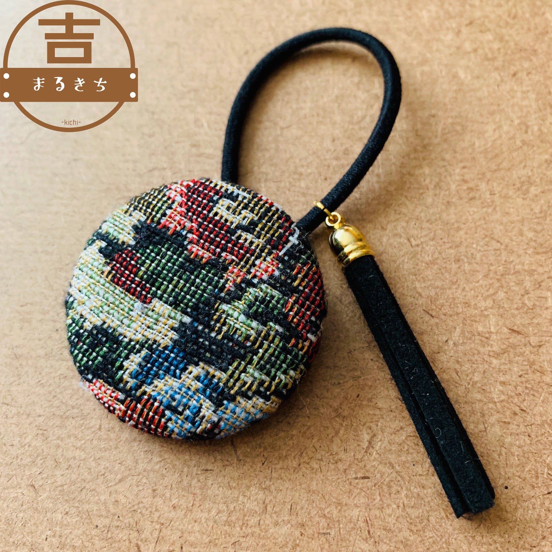 タッセル付きゴブランハンドメイドヘアゴム◯フェイクレザータッセル丸◯くるみボタンヘアゴム