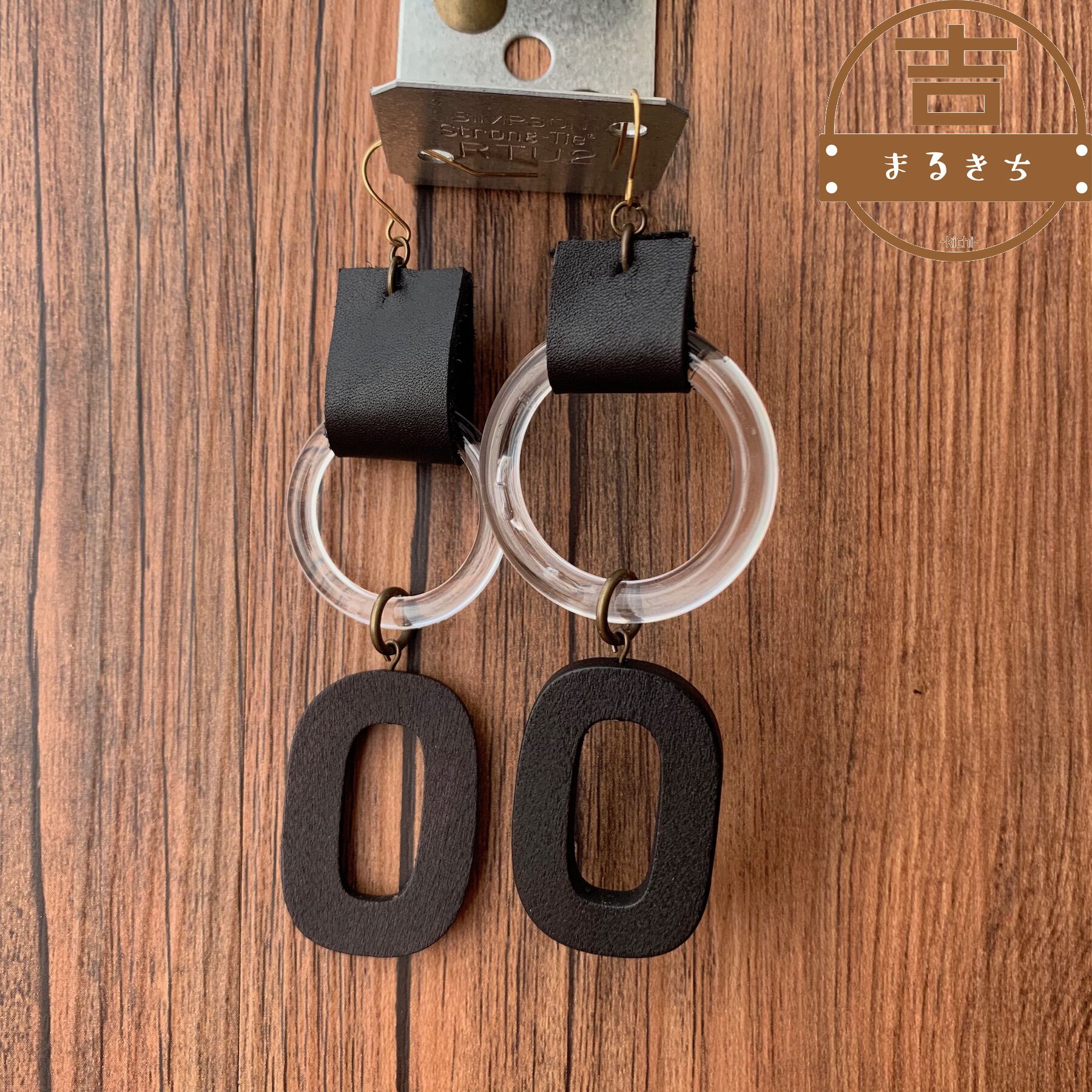 ウッドモード系リングとレザーの大ぶりなハンドメイドピアスです。
