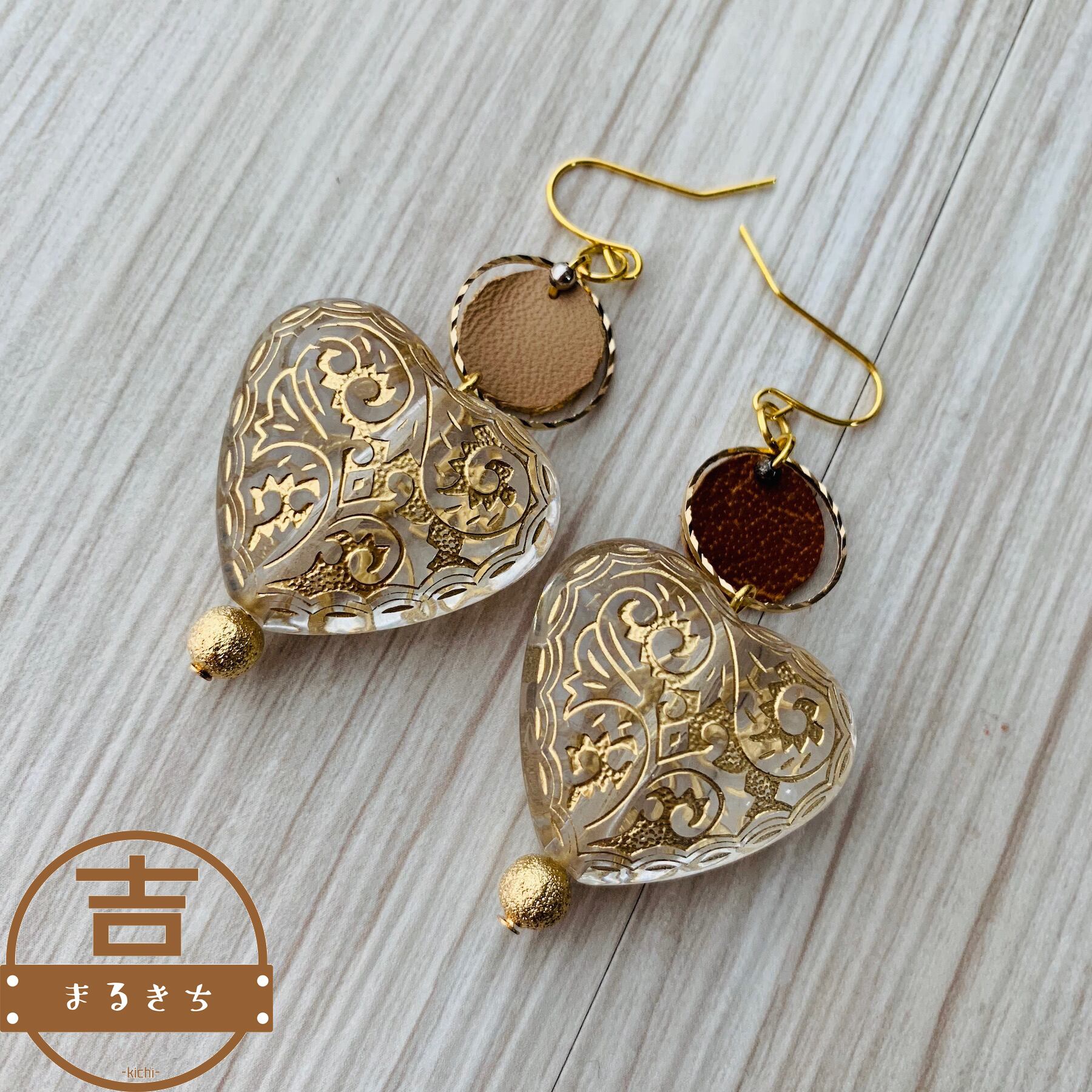 大ぶりなハート型のクリアアンティークパーツと牛革レザーのハンドメイドピアスです。