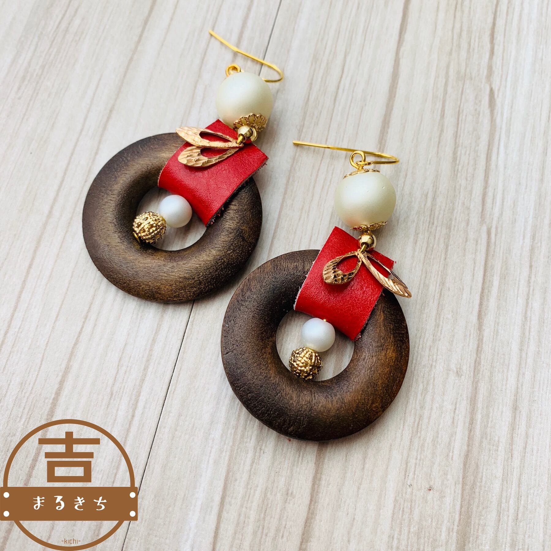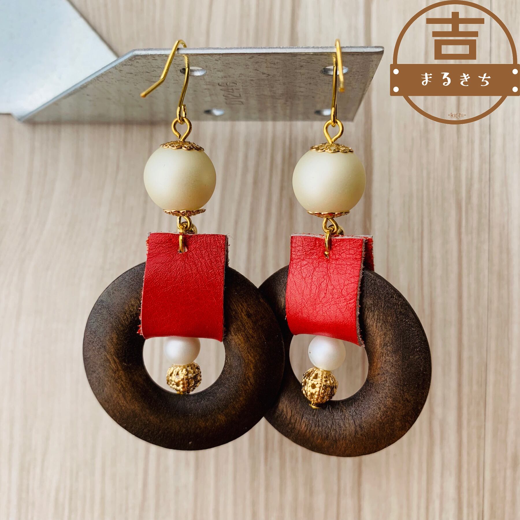 大ぶりなウッドパーツと牛革レザーのハンドメイドピアスです。