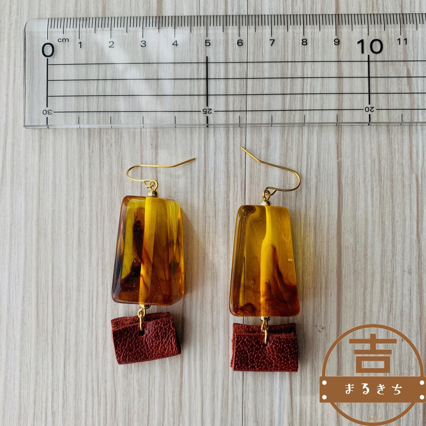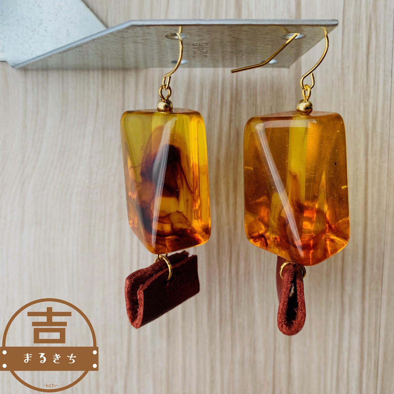 大ぶりなべっ甲柄パーツと牛革レザーのハンドメイドピアスです。