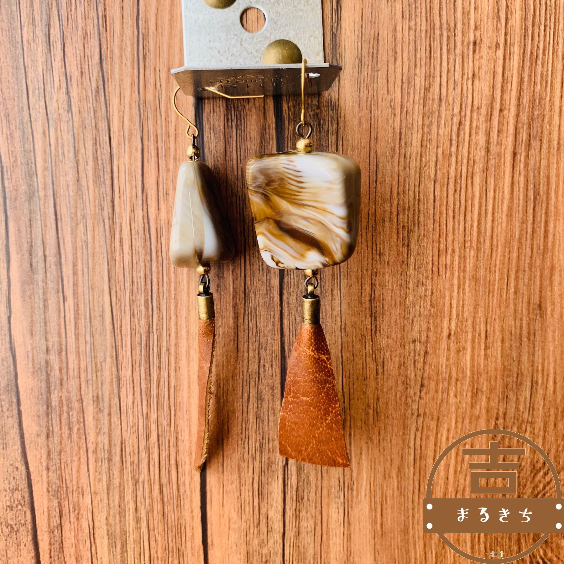 マーブルアクリルストーンとレザーの大ぶりピアス◯ロングハンドメイドピアス◯ブラウン