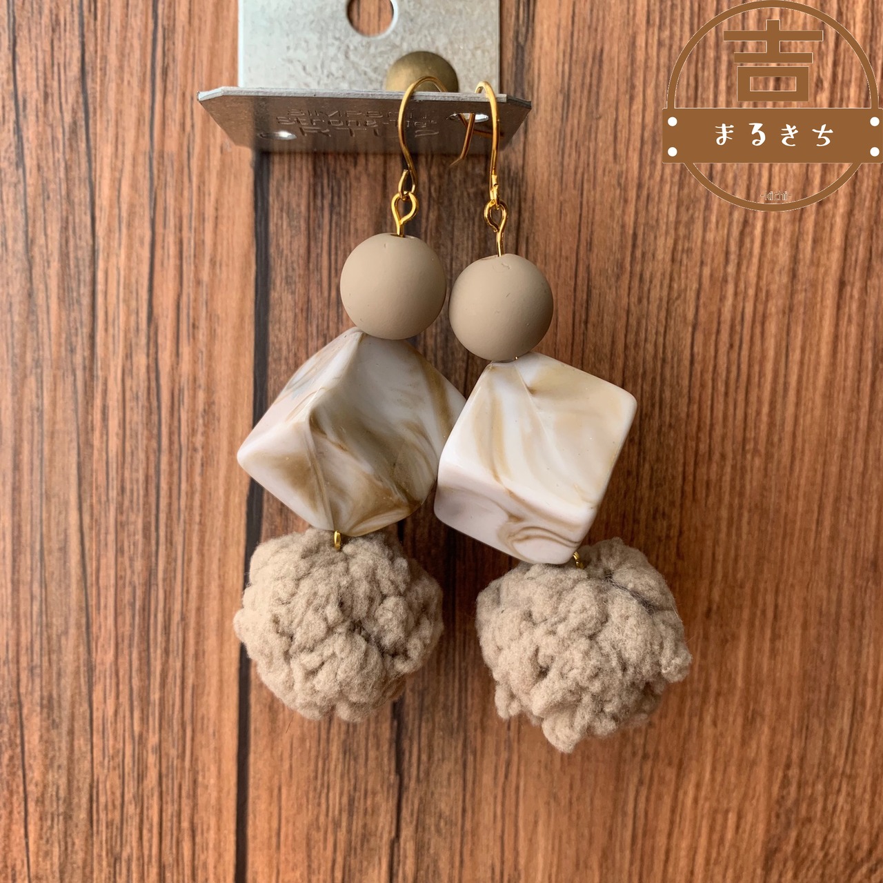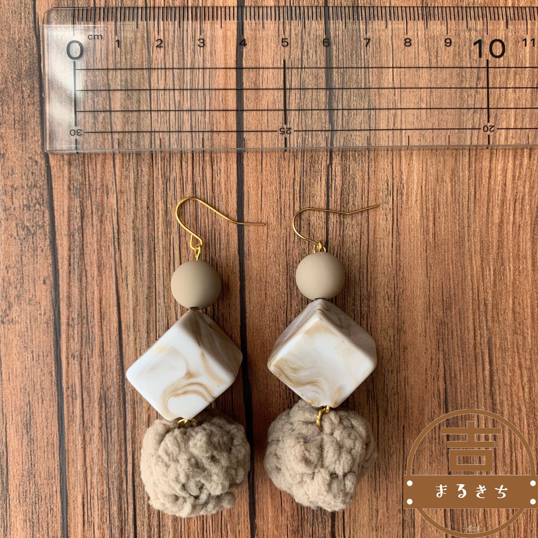 マーブル柄スクエアビーズと、マットビーズ、ボアポンポンのハンドメイドピアスです。