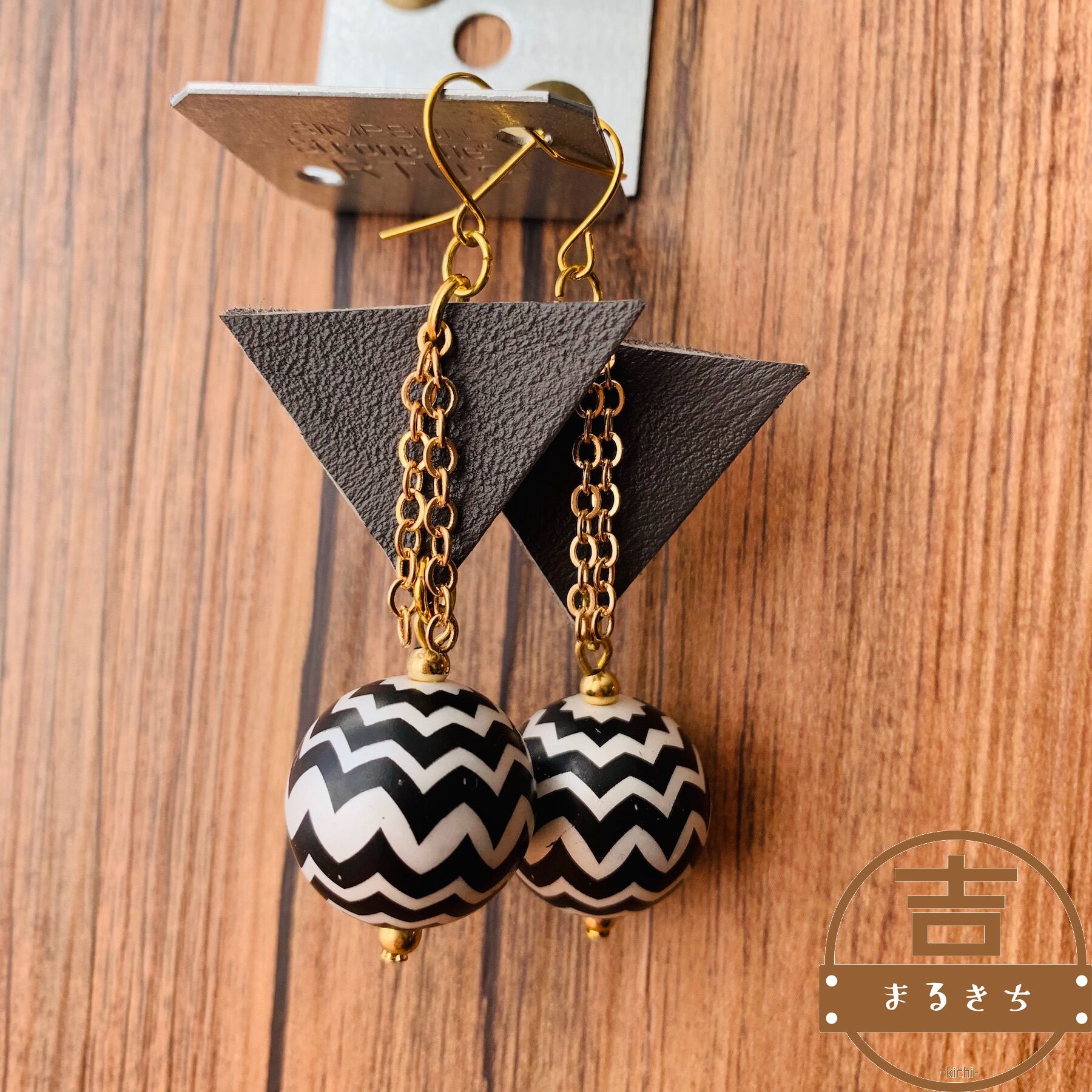 シェブロン柄ビーズと大ぶりな牛革レザーのハンドメイドピアスです。