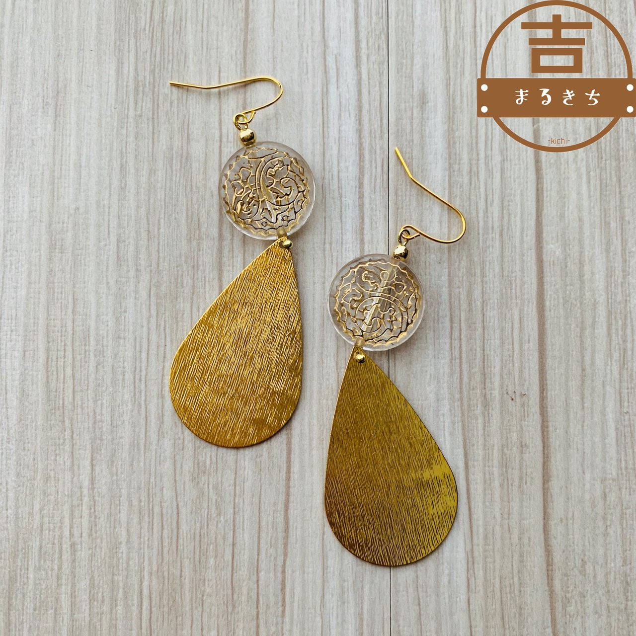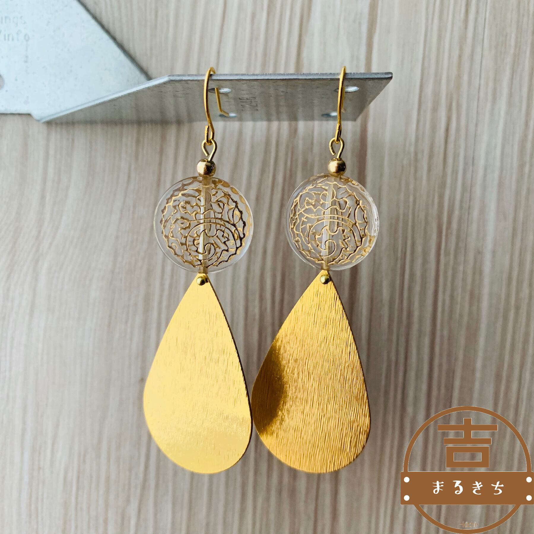 しずく型ゴールドメタルパーツとアンティークビーズのハンドメイドピアスです。