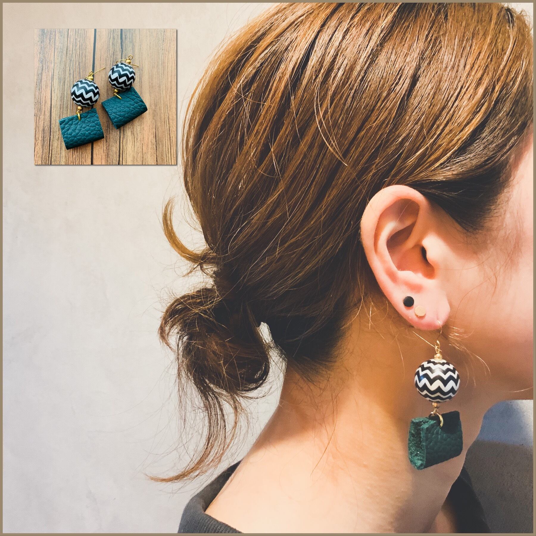 ブラックシェブロン柄ビーズとレザーのピアス◯カジュアルピアス◯大振りピアス