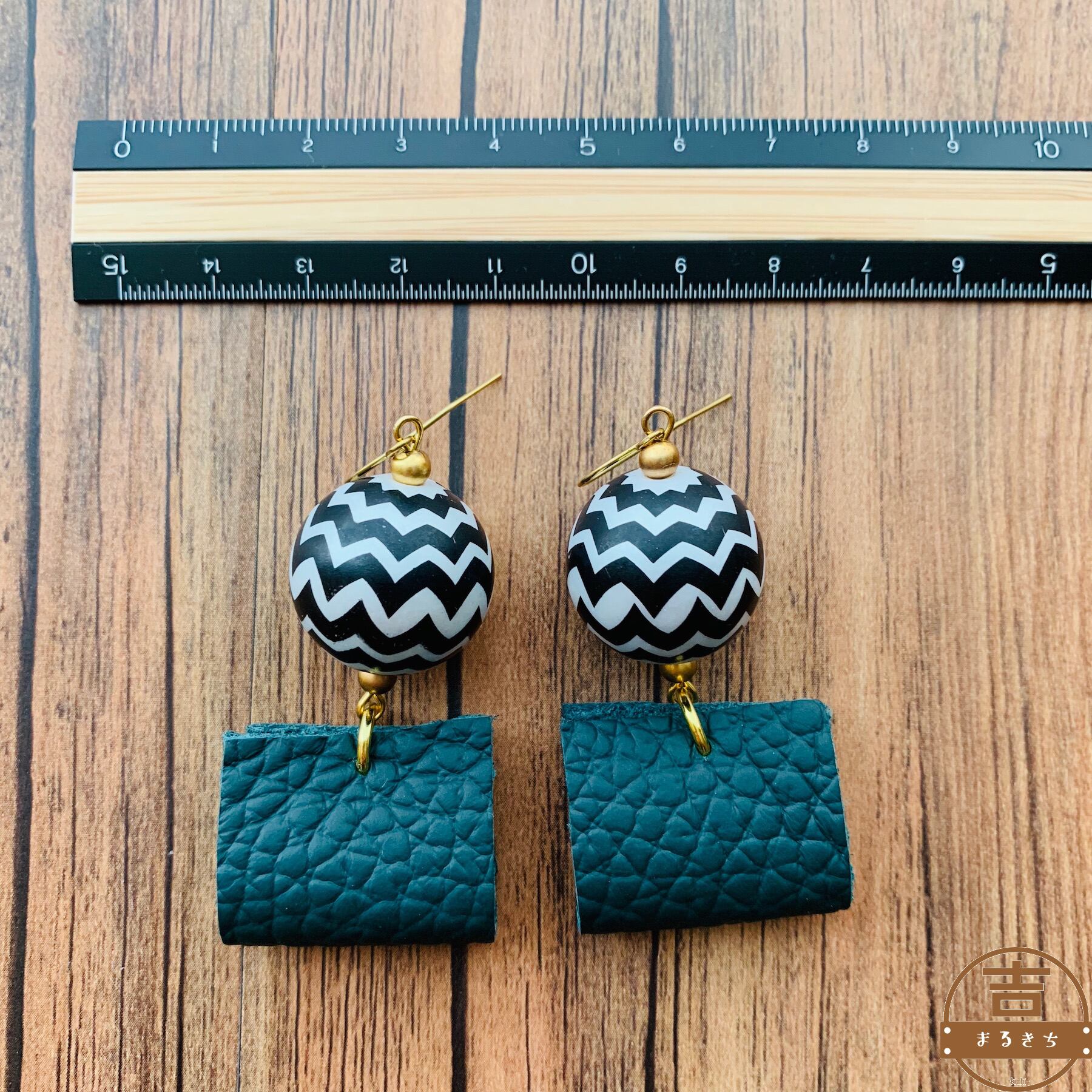 ブラックシェブロン柄ビーズと牛革レザーのハンドメイドピアスです。