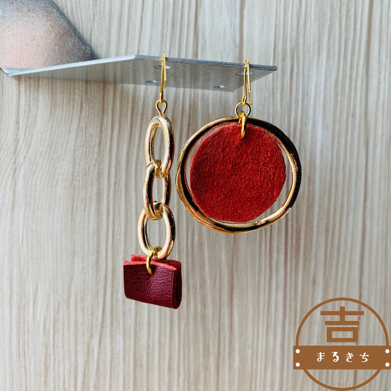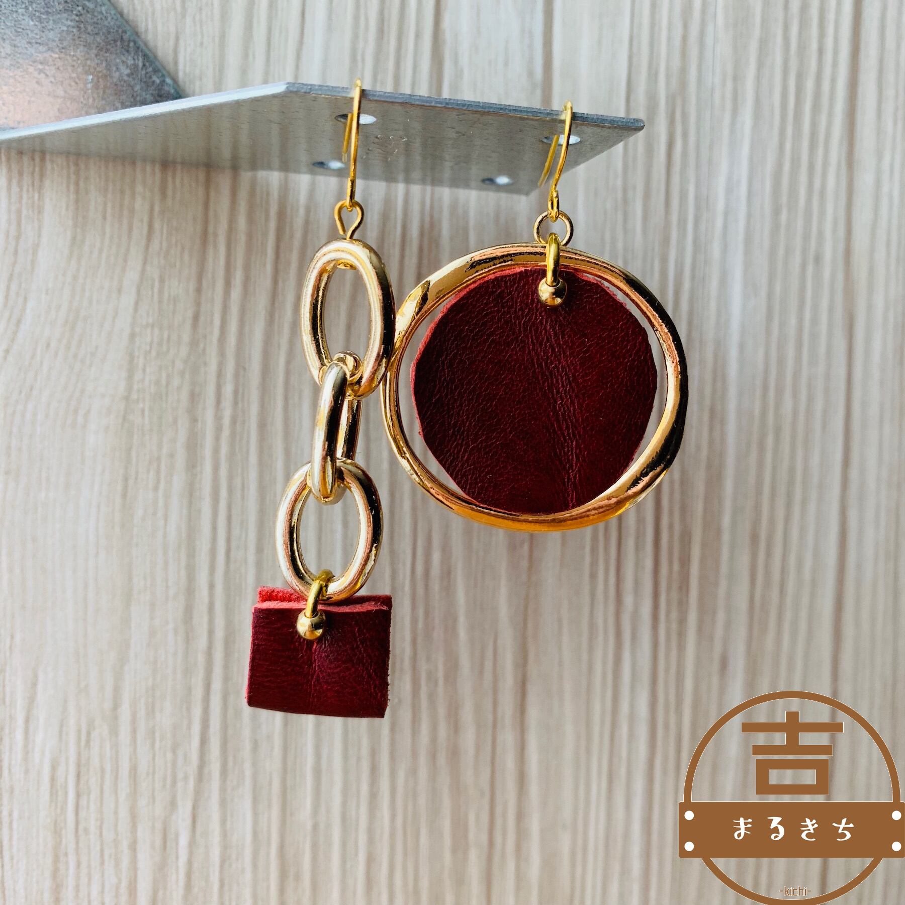 大ぶりな牛革レザーとゴールドパーツ、チェーン型チャームと牛革レザーのアシンメトリーデザインのハンドメイドピアスです。
