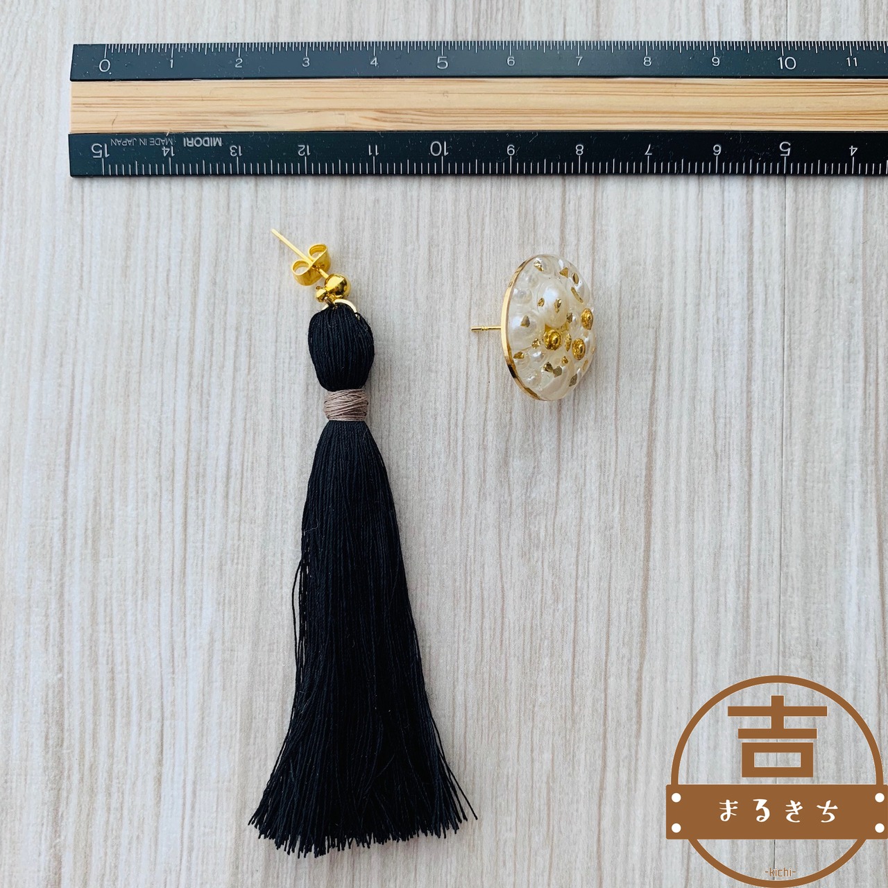 タッセルピアスとレジンピアスのアシンメトリーピアス◯ハンドメイドピアス◯ブラック