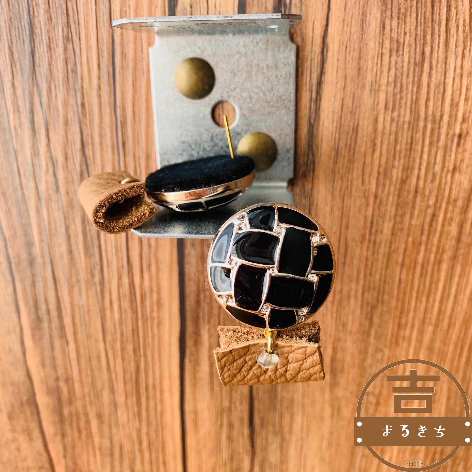 アンティークボタンとレザーのハンドメイドピアス◯ヴィンテージピアス◯キャメル