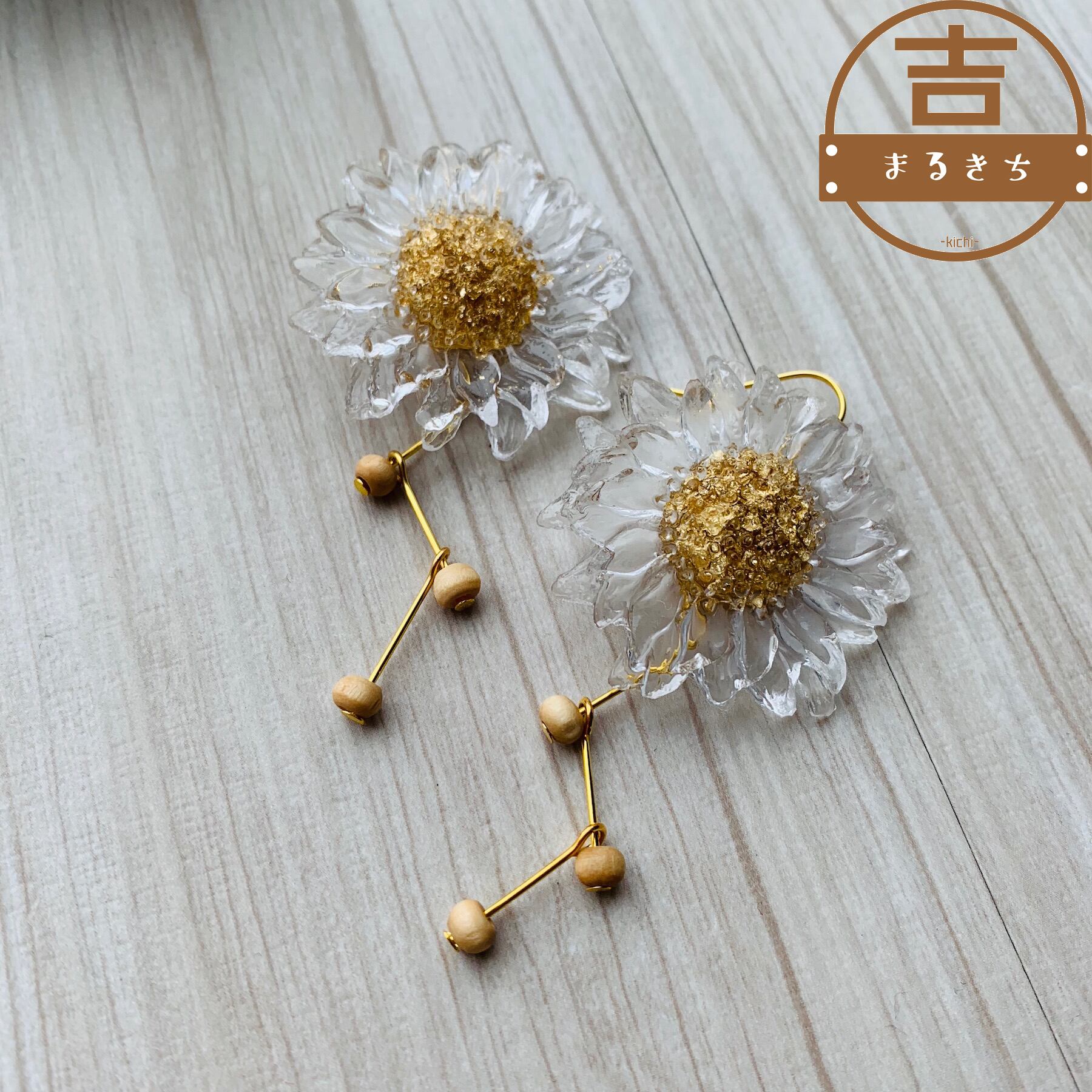 大ぶりクリアフラワーのハンドメイドピアスです。