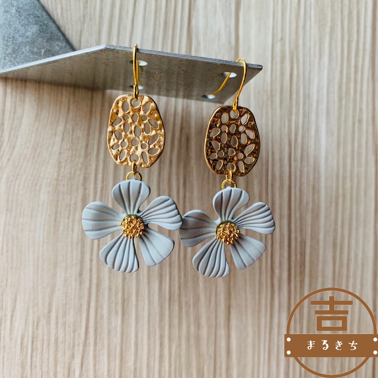マットカラーのフラワーとゴールドパーツのハンドメイドピアスです。