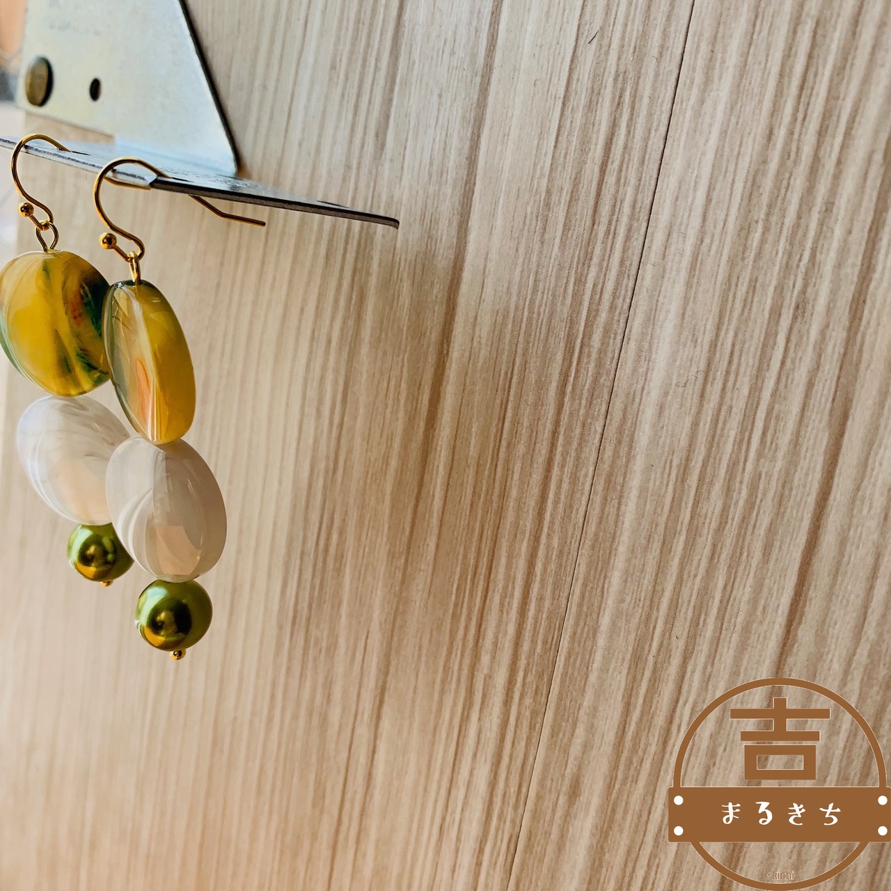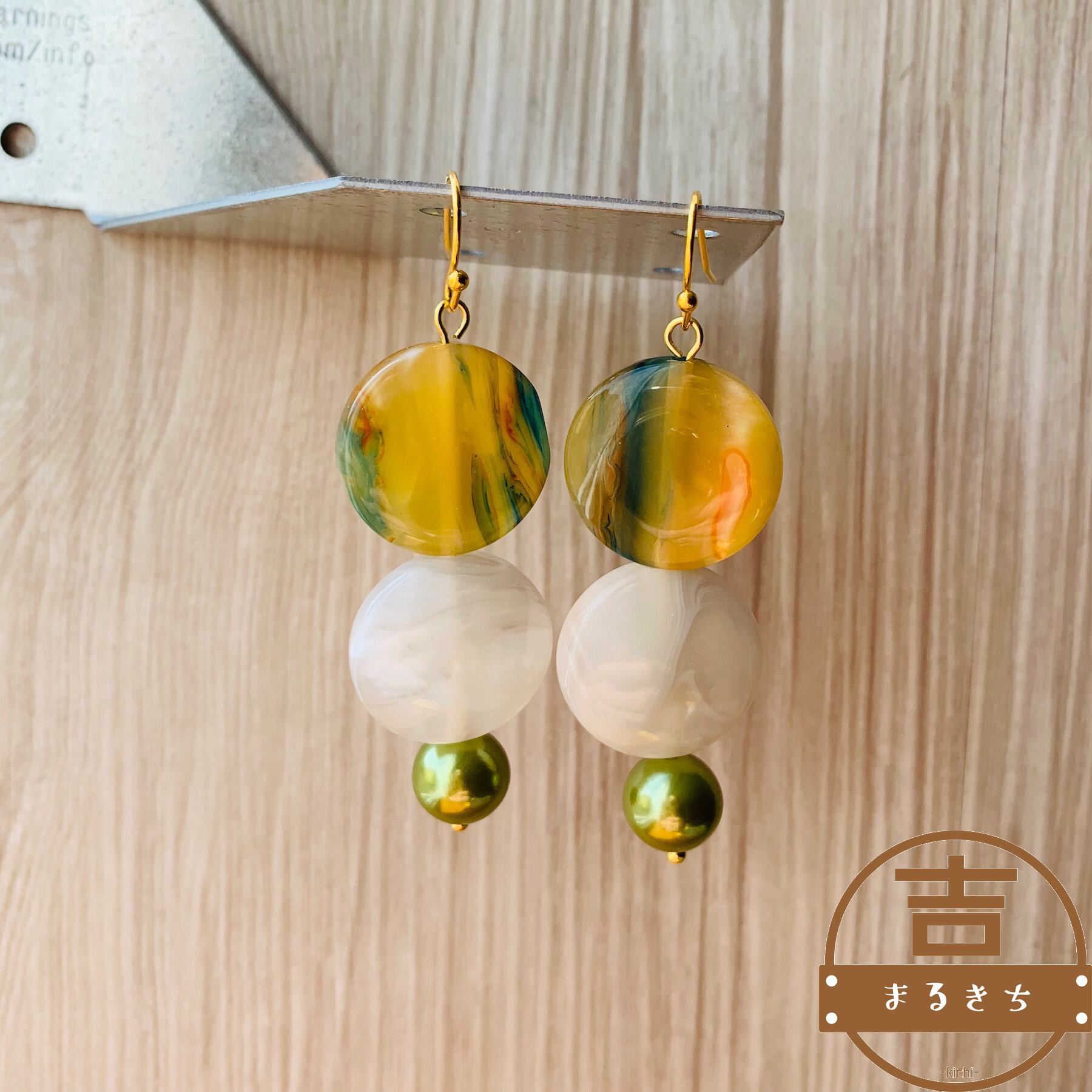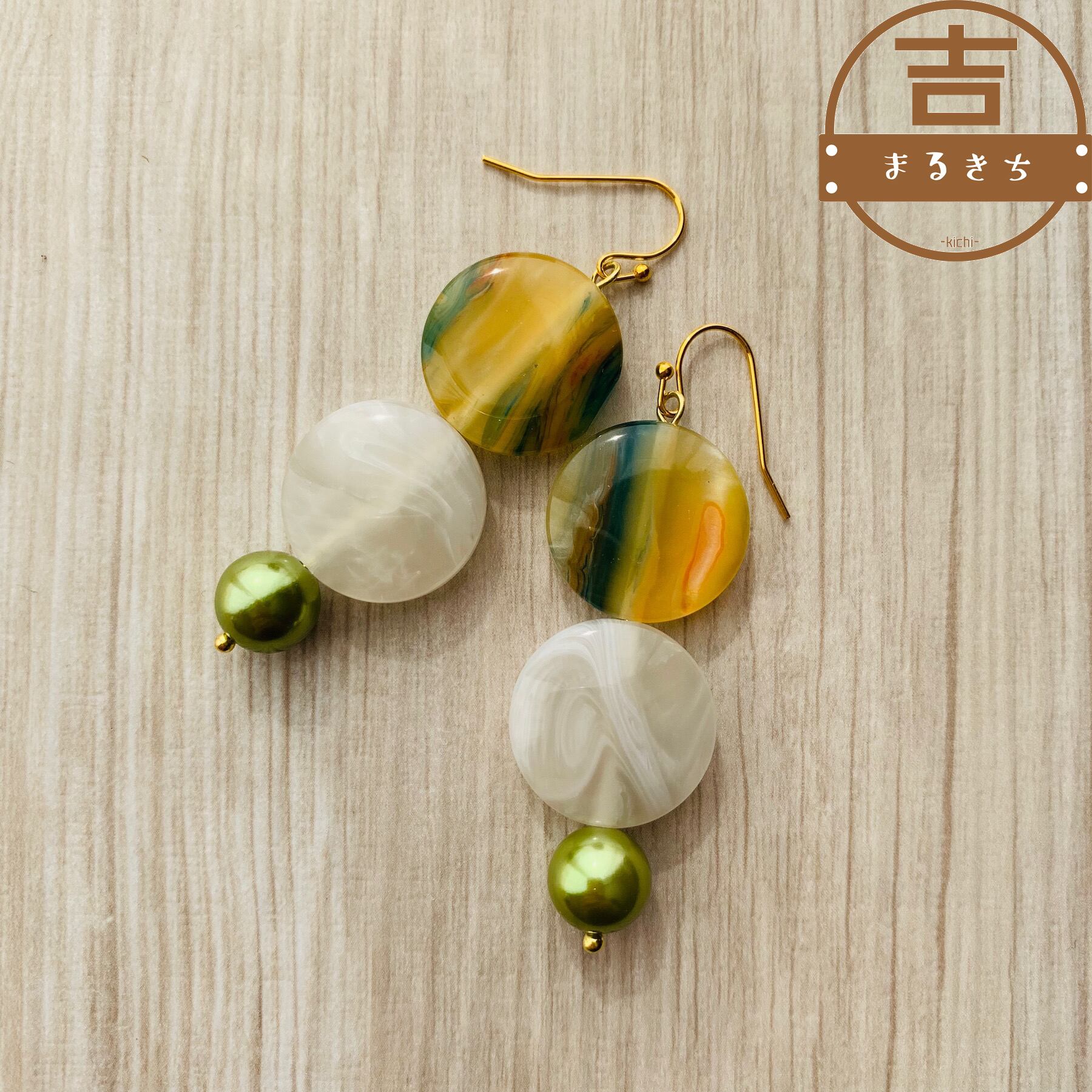 ビタミンドロップピアス◯マーブルビタミンカラーのゲンキピアス◯ホワイト×イエロー×グリーン