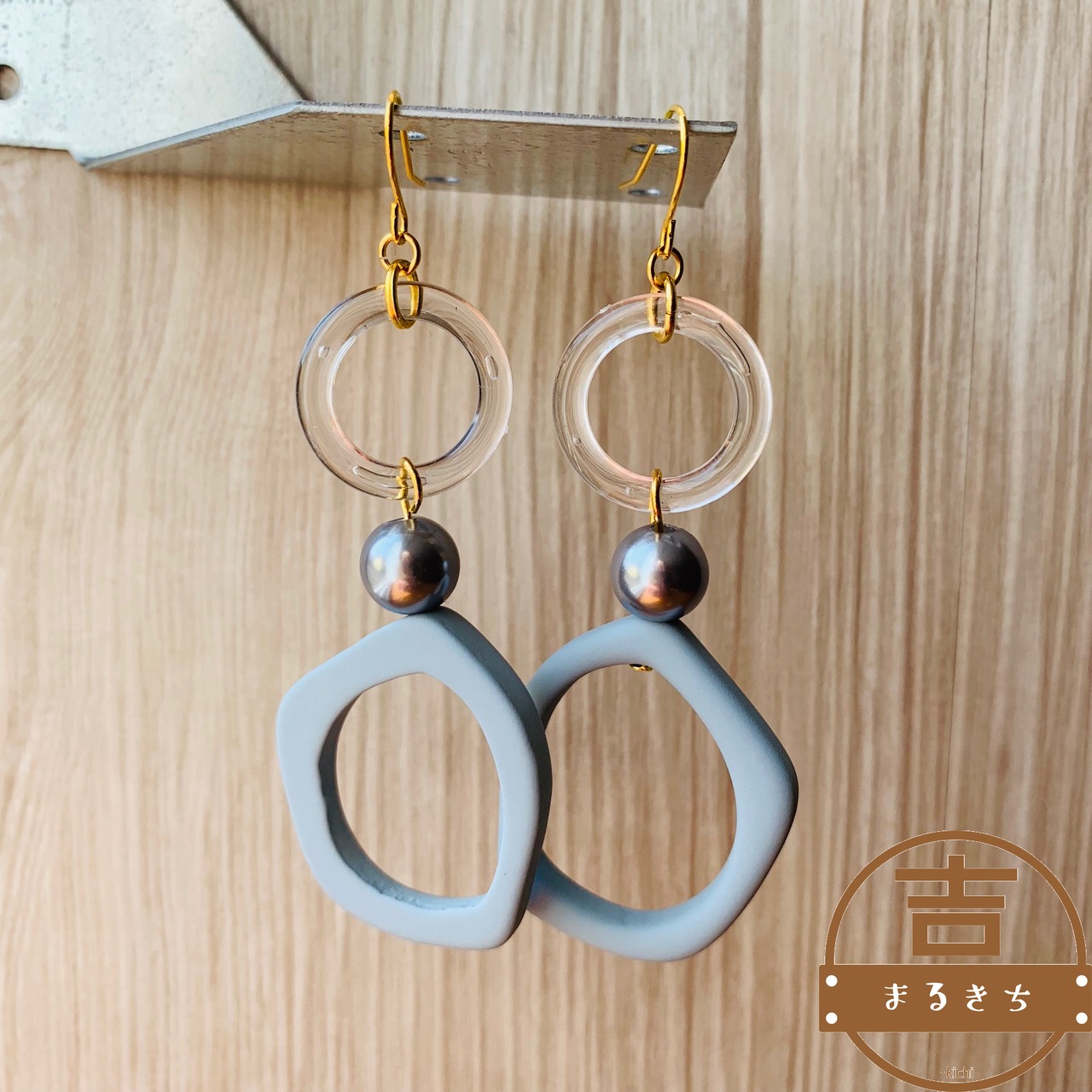 大ぶりなマット素材の変形リングとクリアリングのハンドメイドピアスです。