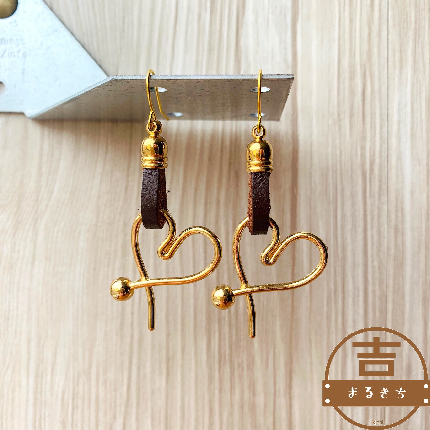 レザーとゴールドカラーのハートで大人カジュアルなピアス。