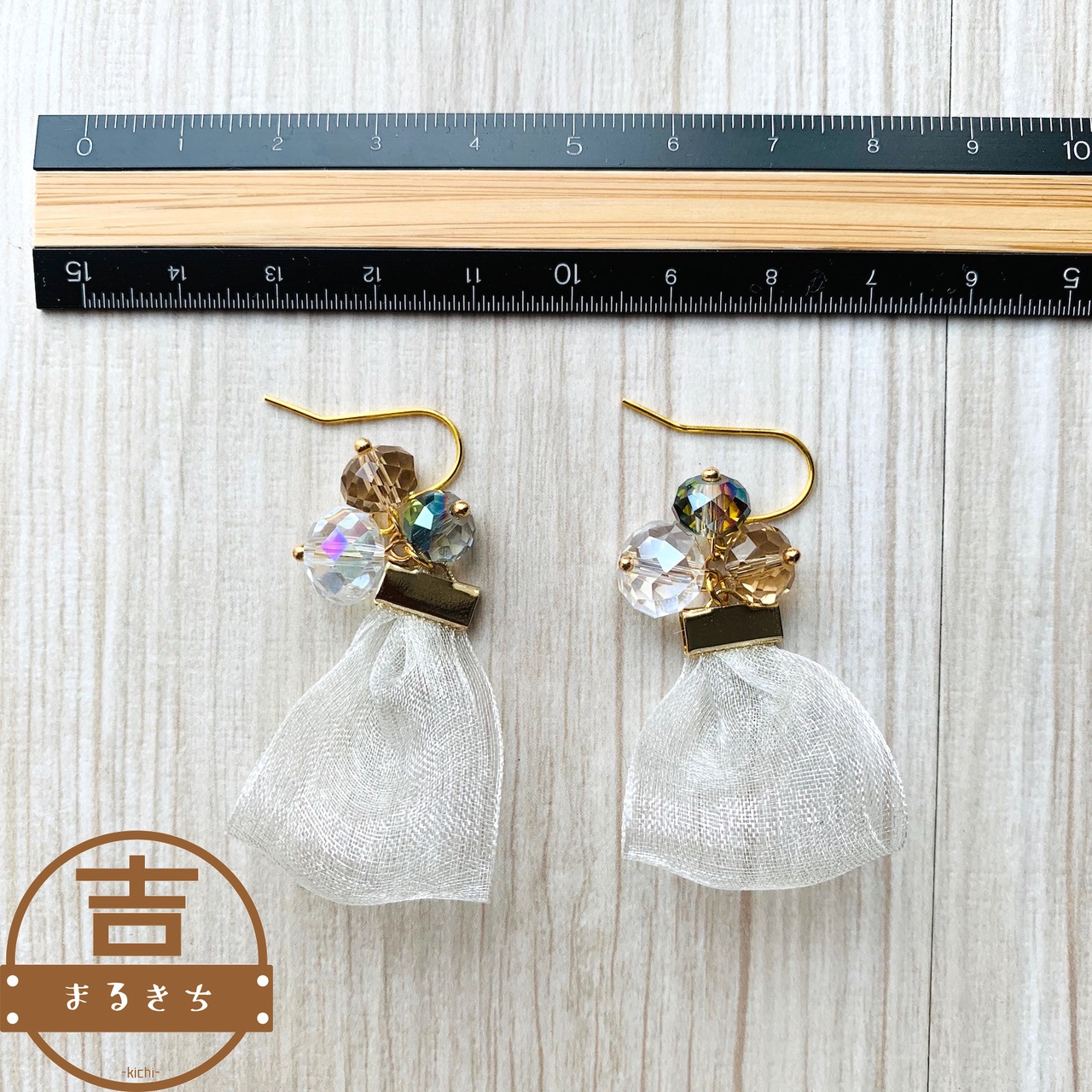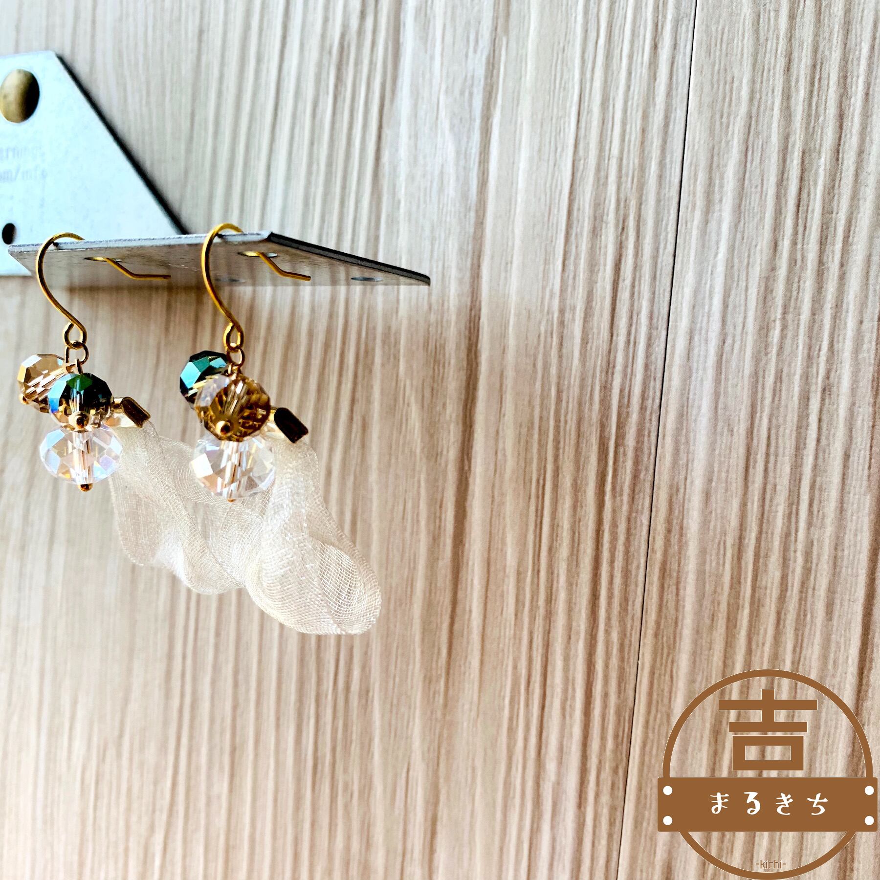 ボタンカットビーズとリボンの大人ピアス◯ホワイト◯ハンドメイドピアス