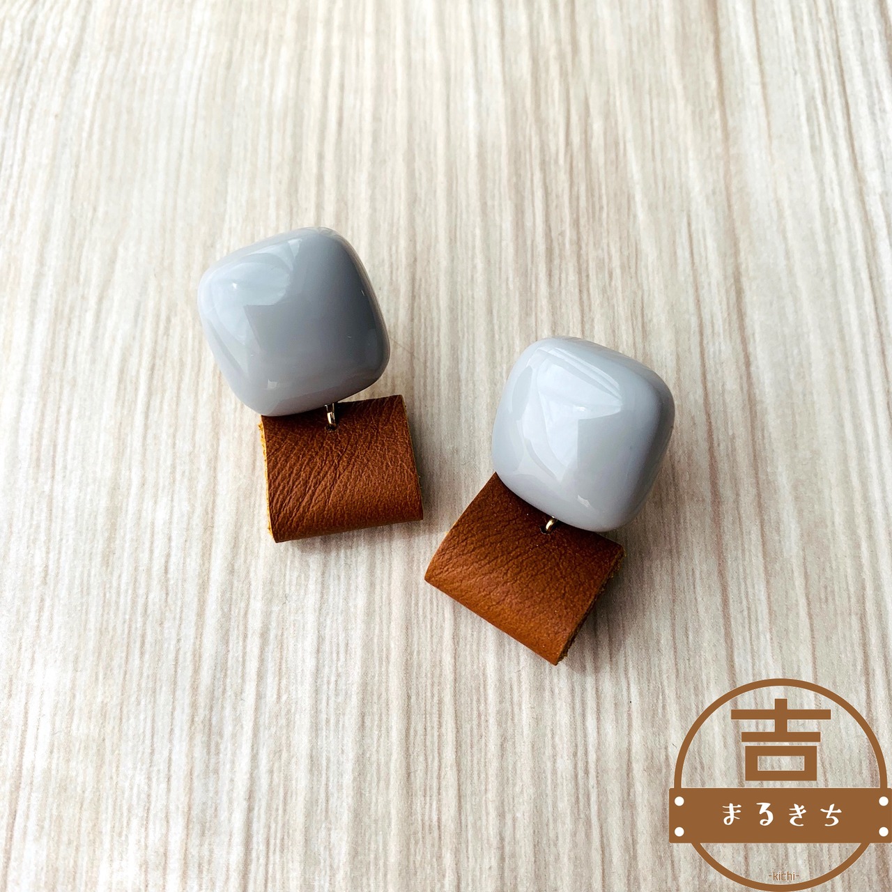 スクエアカボションピアス◯レザーと四角のシンプルピアス◯ハンドメイドピアス◯グレー