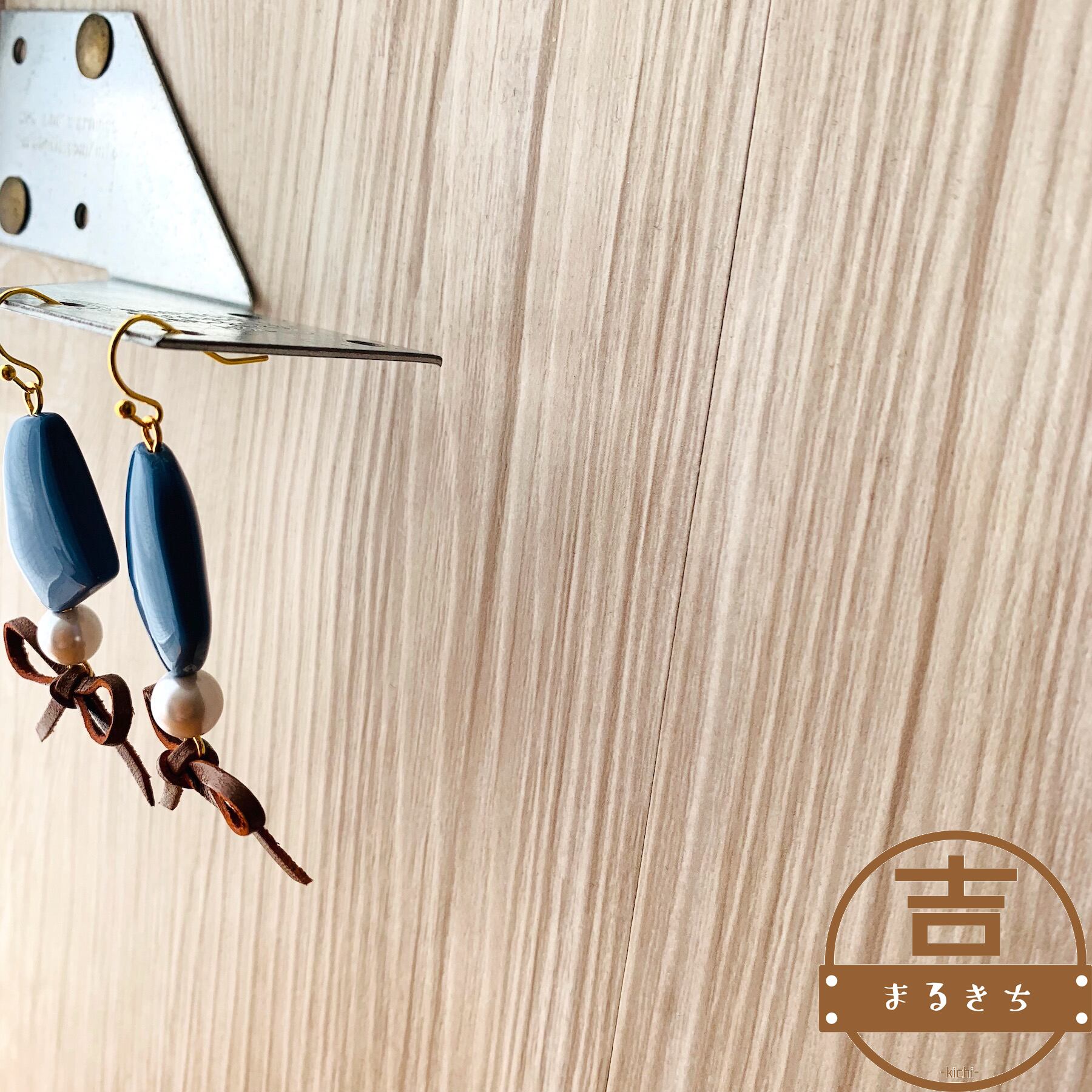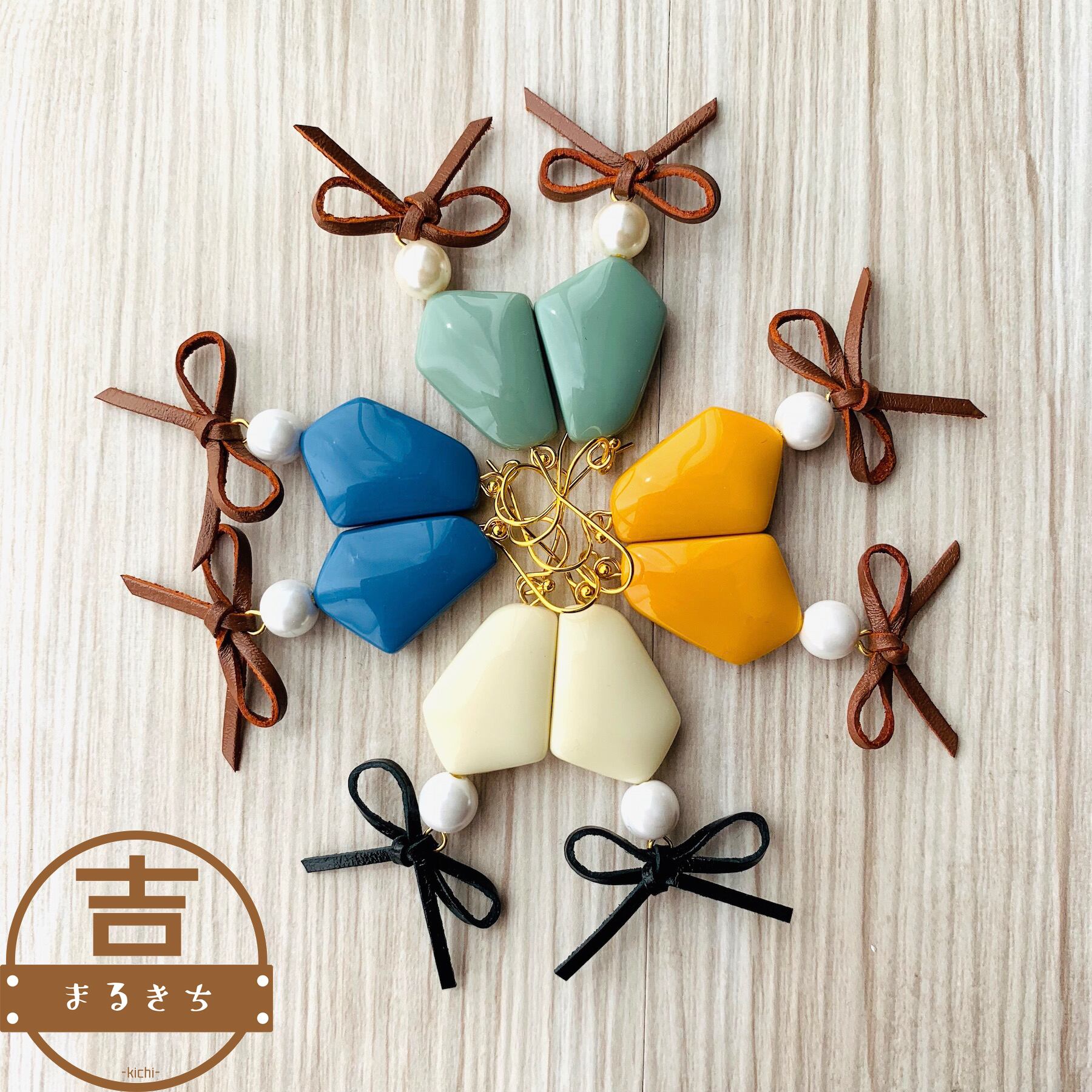 変形五角形とレザー紐で作ったリボンを合わせました。