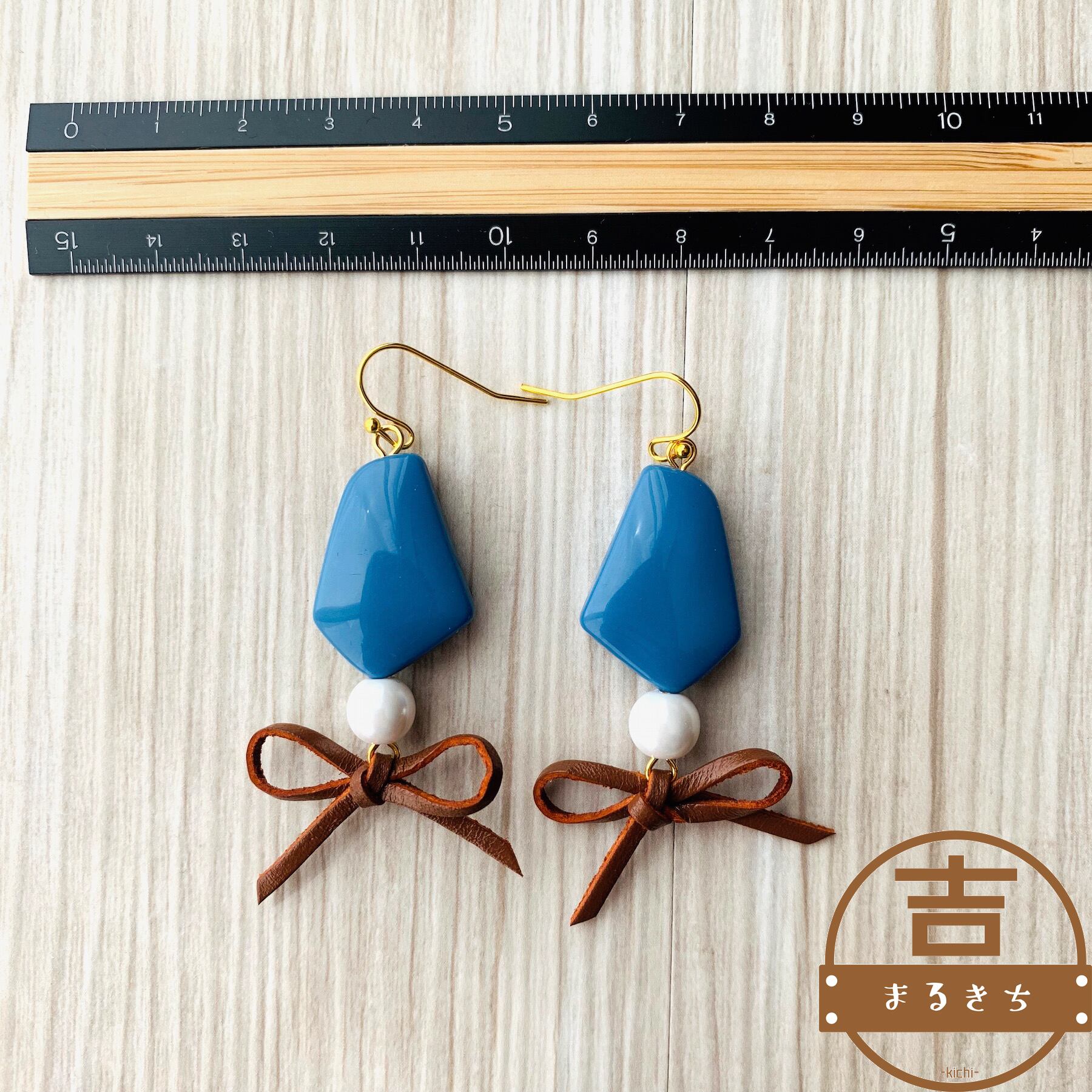 ペンタゴンピアス◯変形五角形とレザーリボンピアス◯ハンドメイドピアス◯ブルー