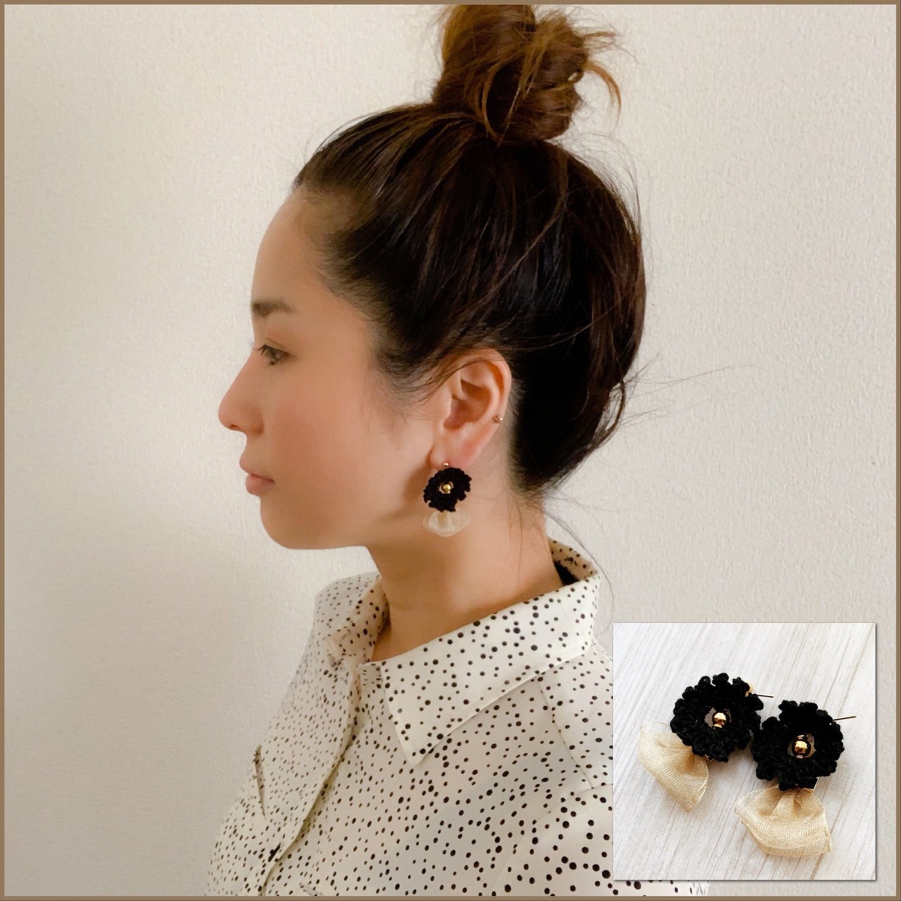 お花のピアス◯フラワーピアス◯お花のモチーフにレースの大人可愛いピアス◯ハンドメイドピアス◯黒