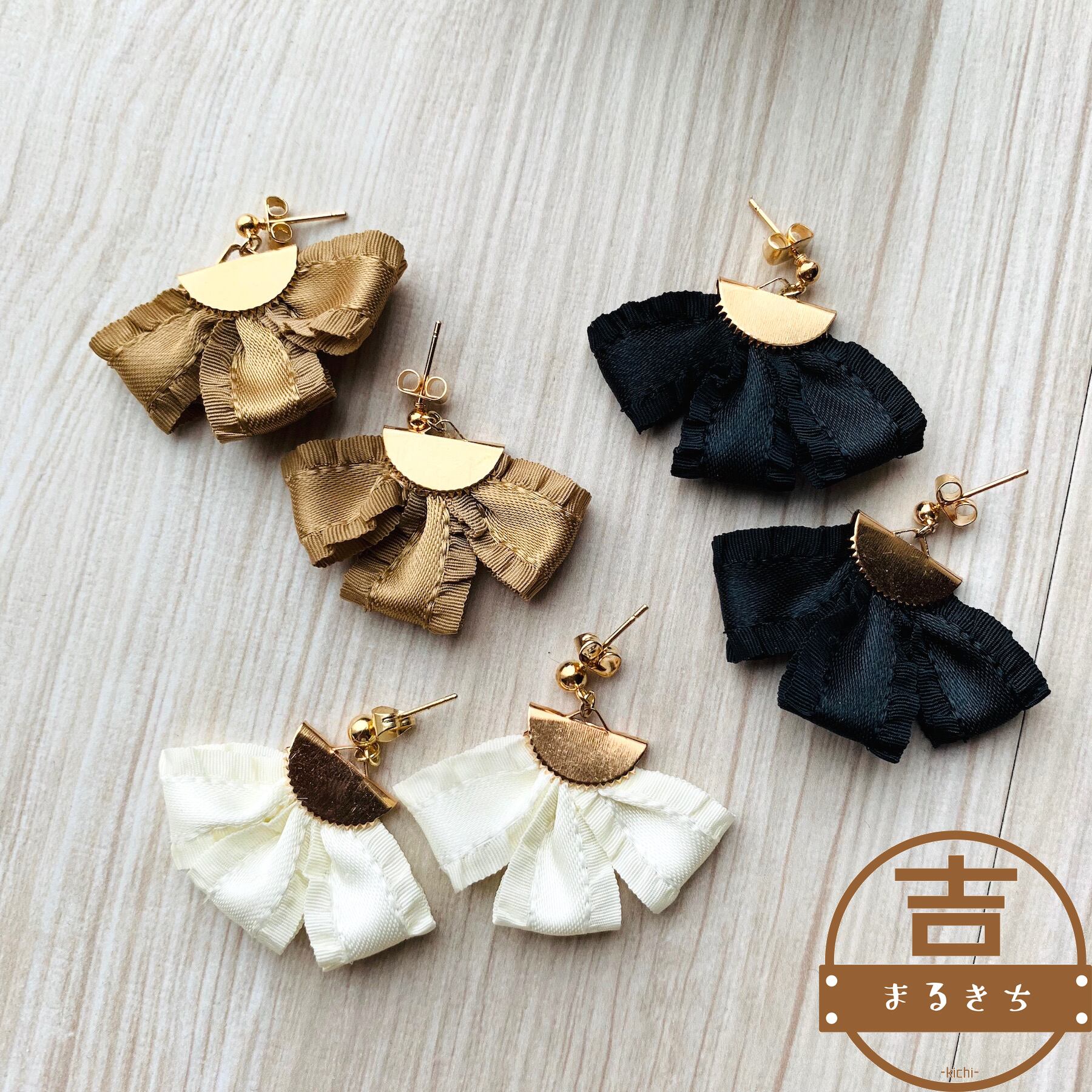 フリルリボンピアス◯ブラックピアス◯ハンドメイド扇形ピアス◯大人シンプル