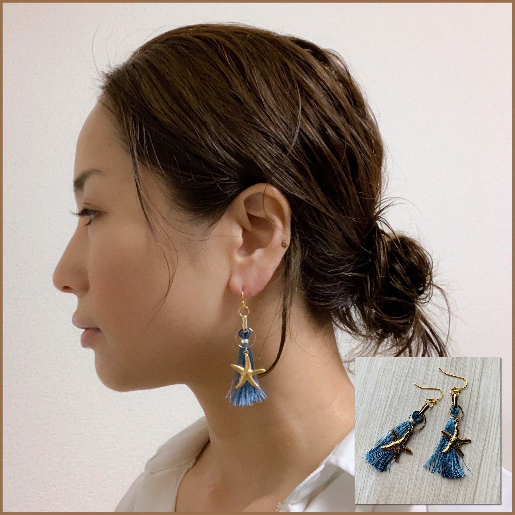 ヒトデチャームとタッセルのハンドメイドピアスです。