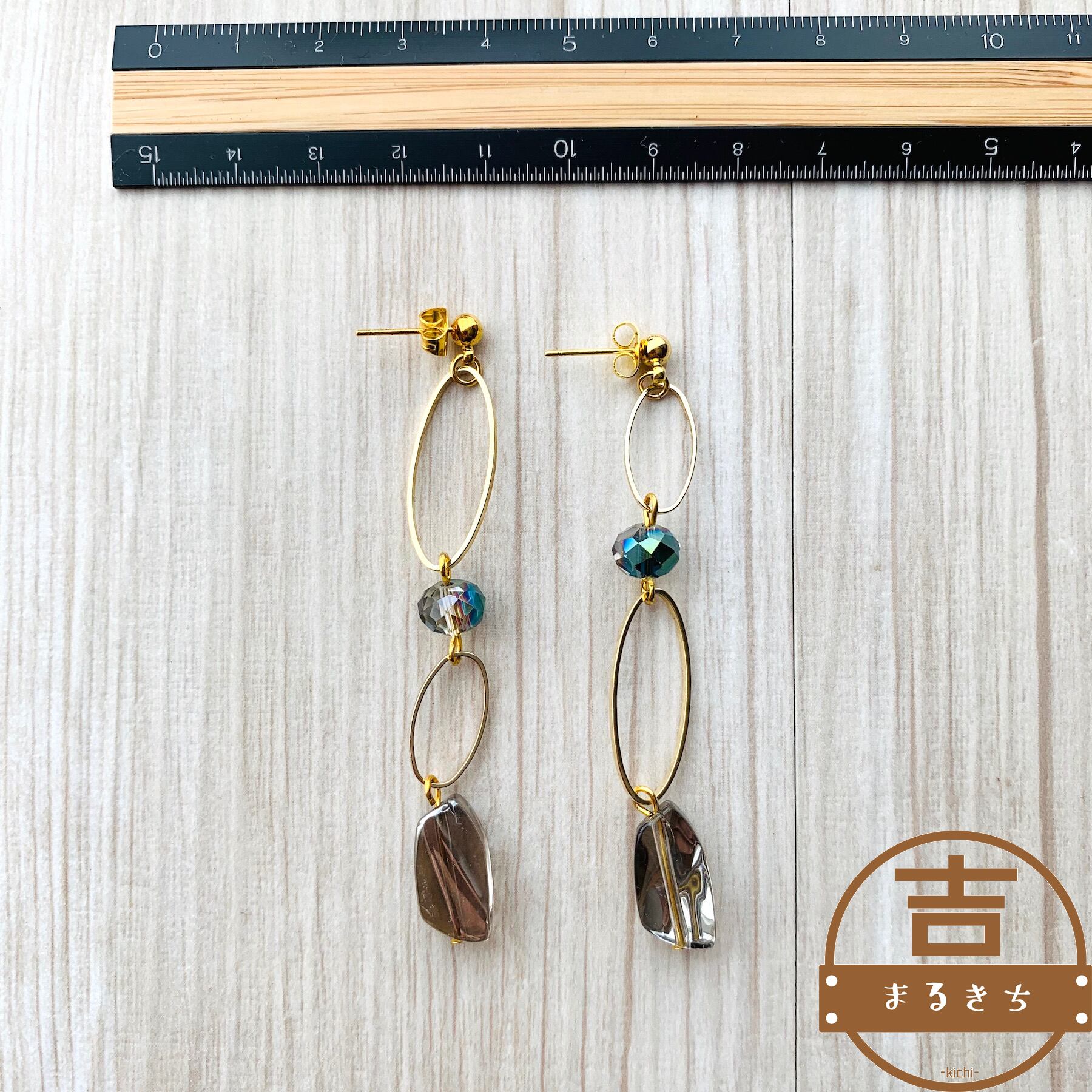 ゴールドとキラキラビーズで大人シンプルなハンドメイドロングピアスです。