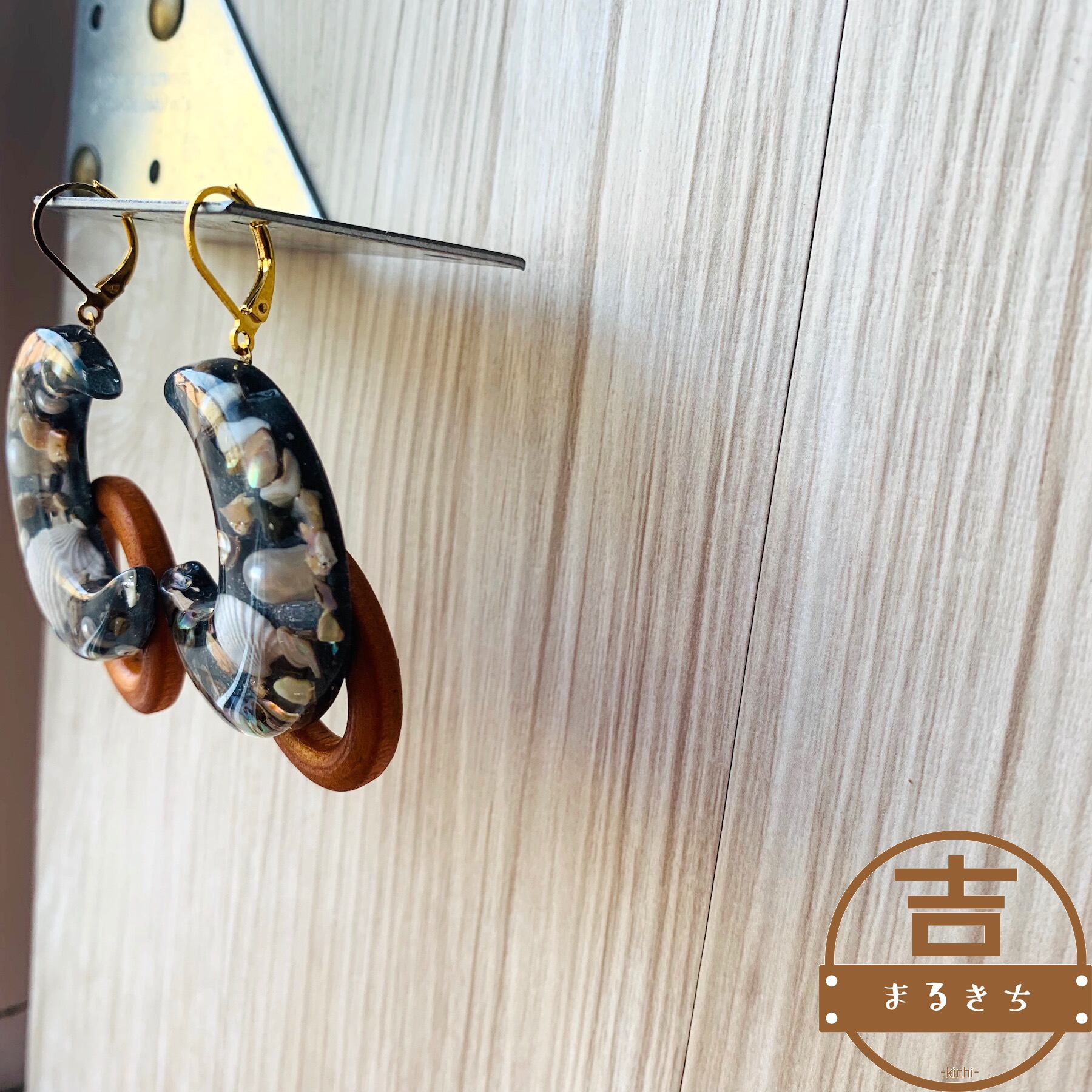 海面をイメージした月形モチーフにウッドリングを合わせた大ぶりなハンドメイドピアスです。