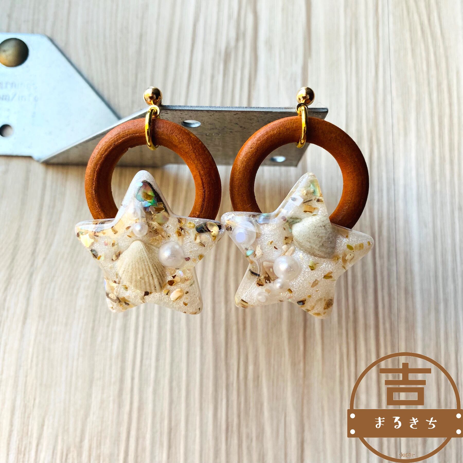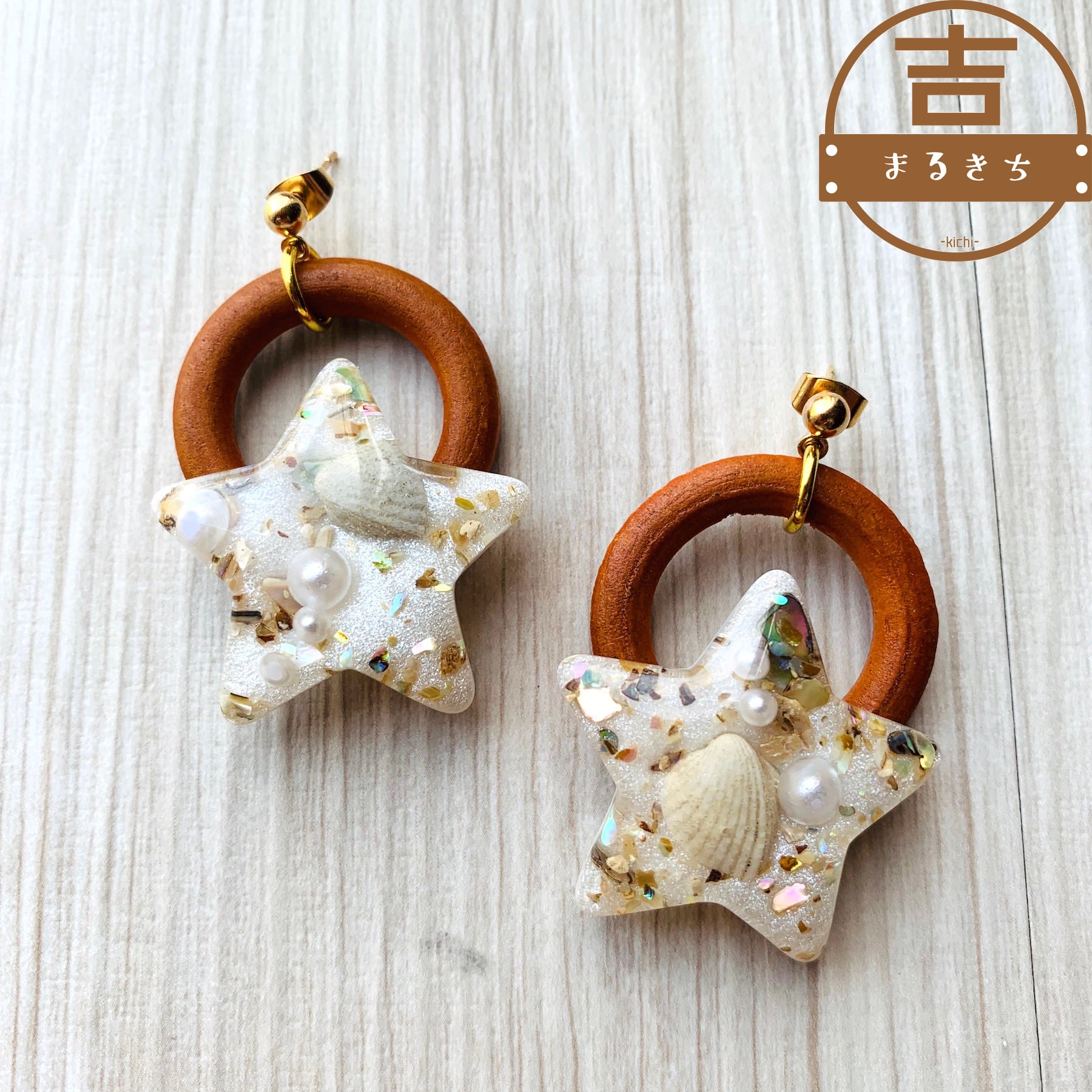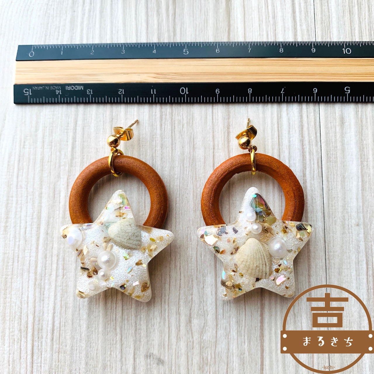 海面をイメージした星形モチーフにウッドリングを合わせた大ぶりなハンドメイドピアスです。