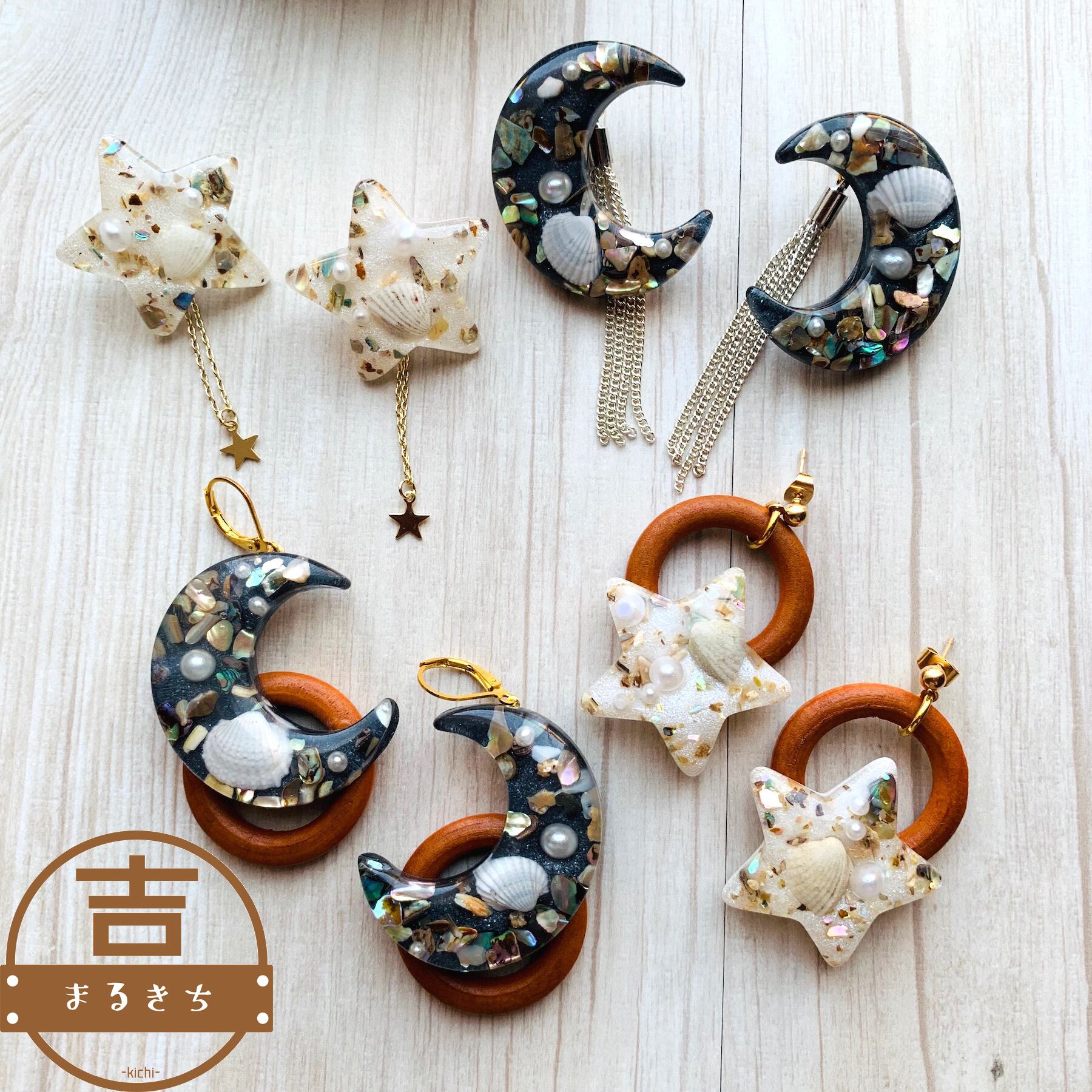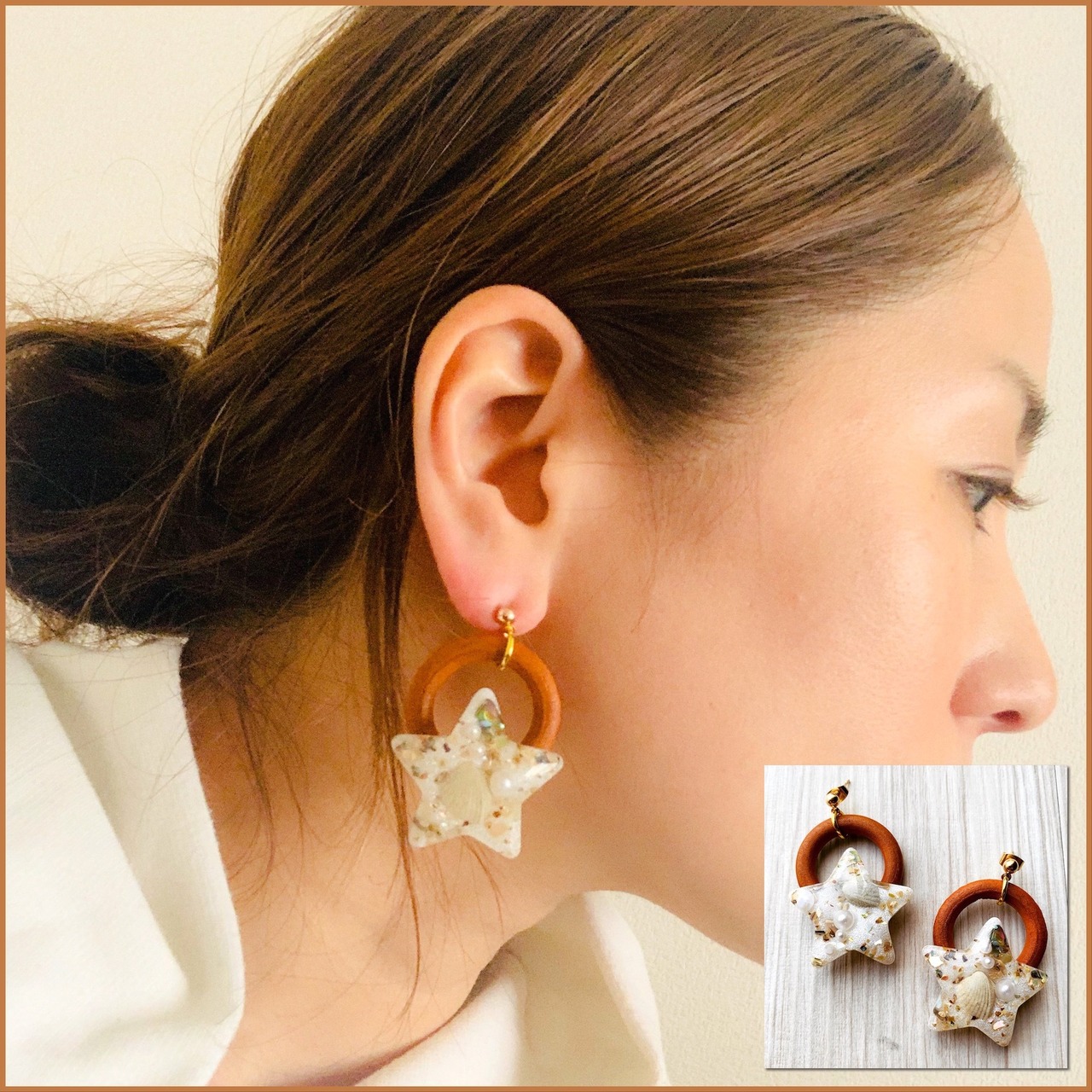 星型ピアス◯ウッドと星の大ぶりピアス◯海面貝殻ピアス◯ハンドメイドピアス