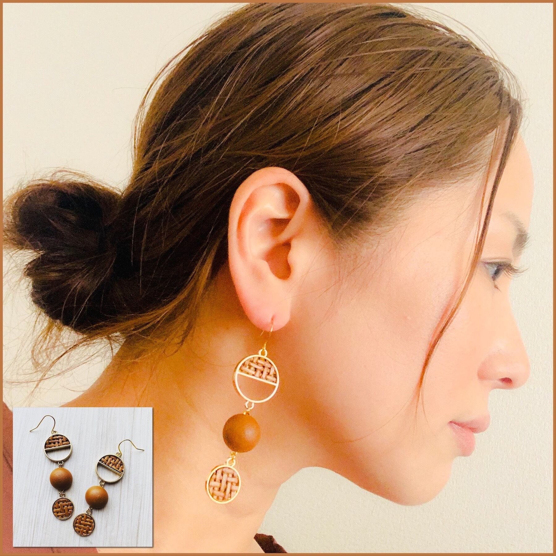 ラタン張りチャームピアス◯ラタンチャームとウッドの大人ピアス◯ハンドメイドピアス