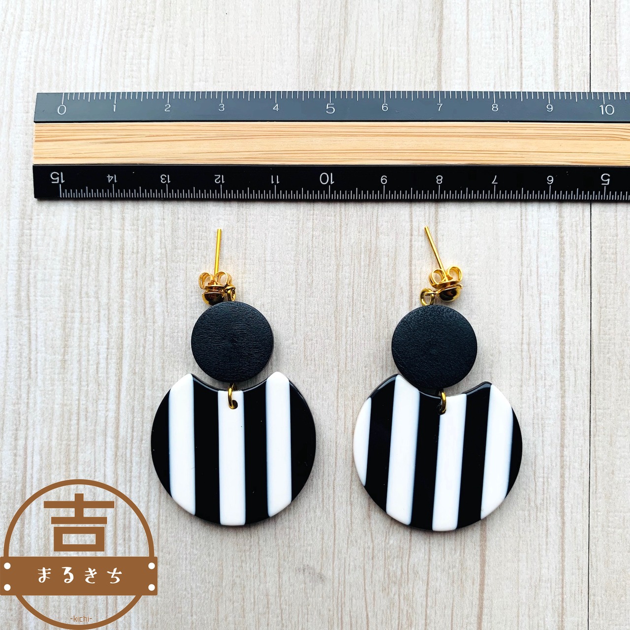 ウッド製ブラックとストライプのモノクロピアス。黒コーデに◎