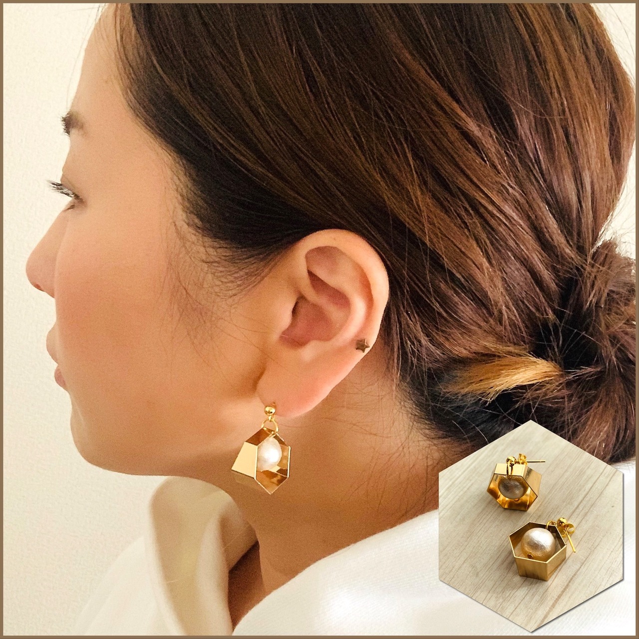 六角形のシンプルピアス◯ゴールド×コットンパール◯サージカルステンレスピアス◯大人シンプルピアス