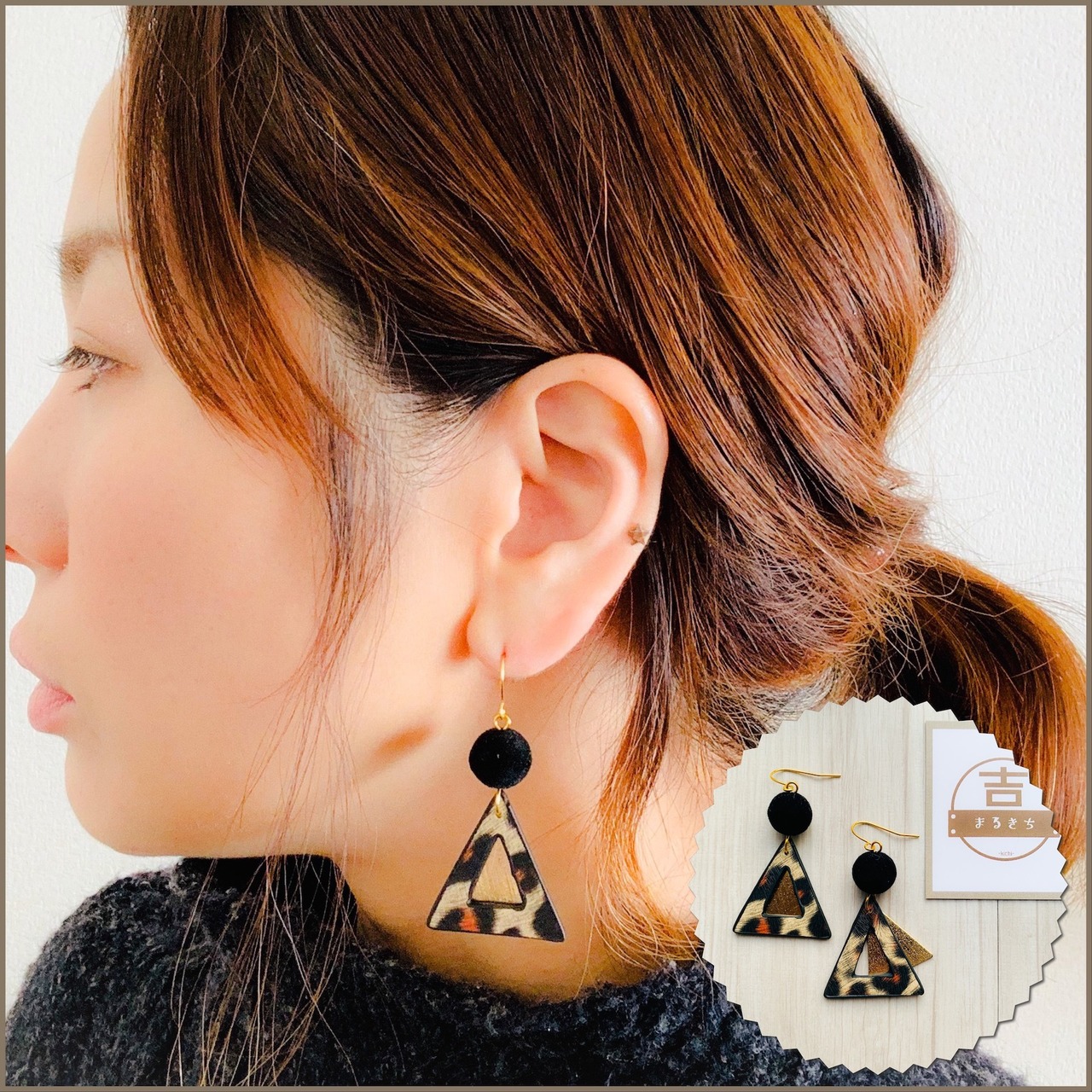 レオパード柄ピアス◯三角×球◯ブラック×ゴールド×レオパードピアス
