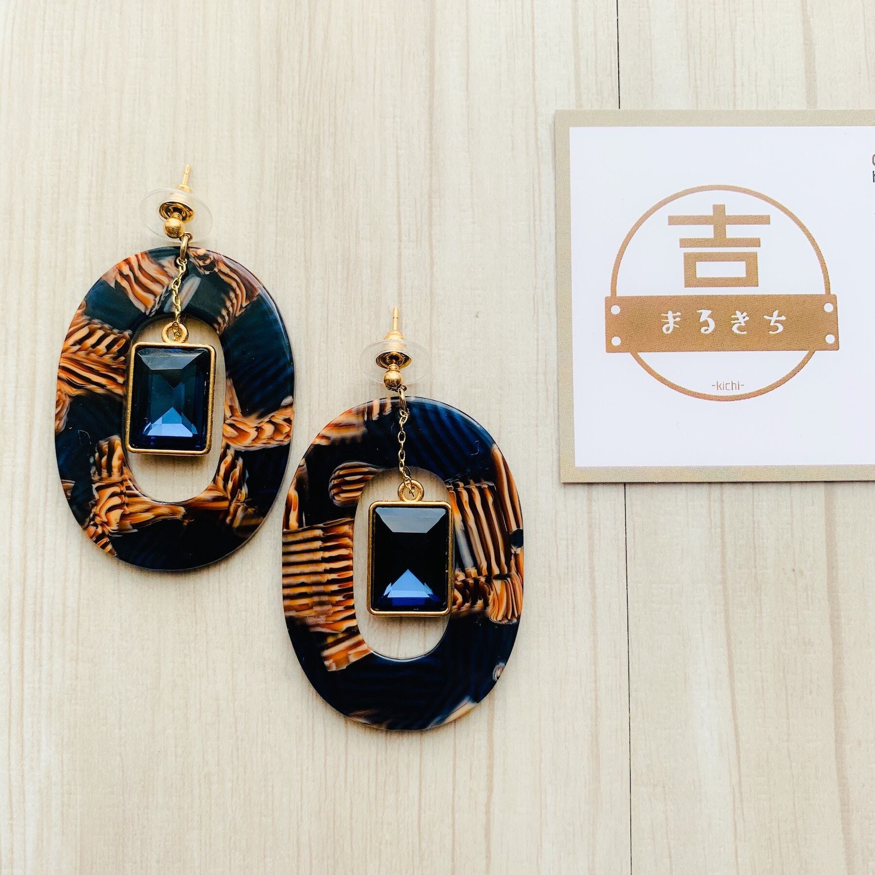 レトロピアス◯ブラック×ブラウン×ブルー◯大振り個性的ピアス