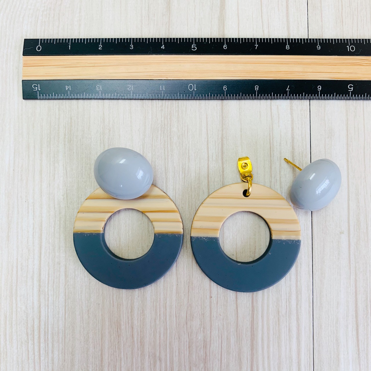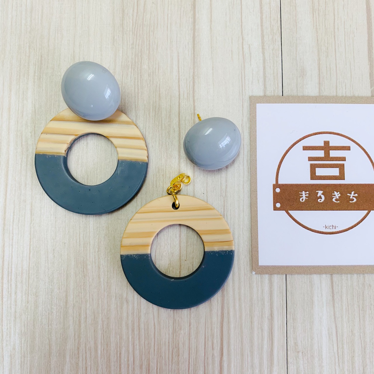 木目柄とグレーカラーのハーフリングにカボションを合わせた2wayピアスです。