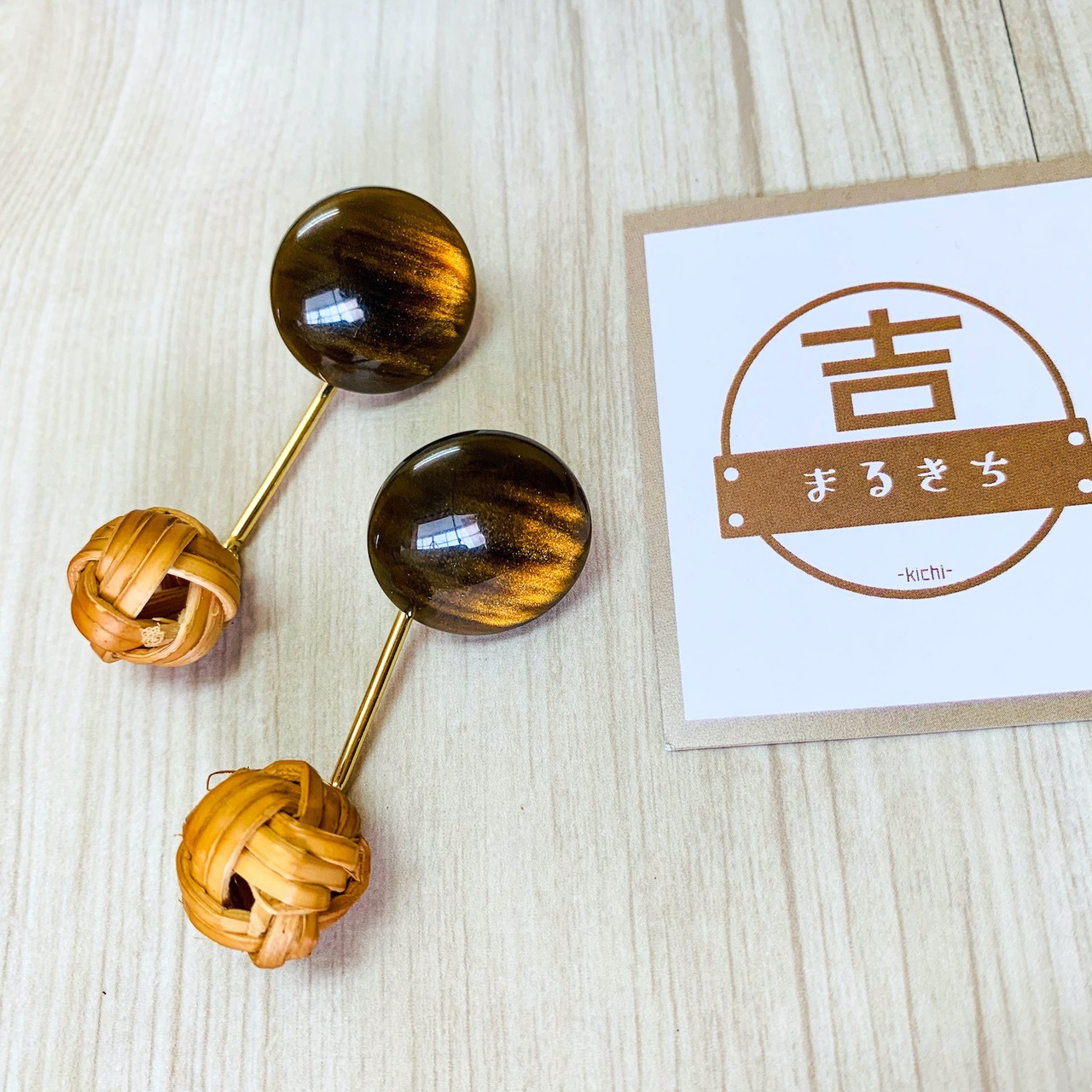 ラタンボールピアス○カボション×ラタンボール○ブラウンとゴールドの揺れる2wayピアス