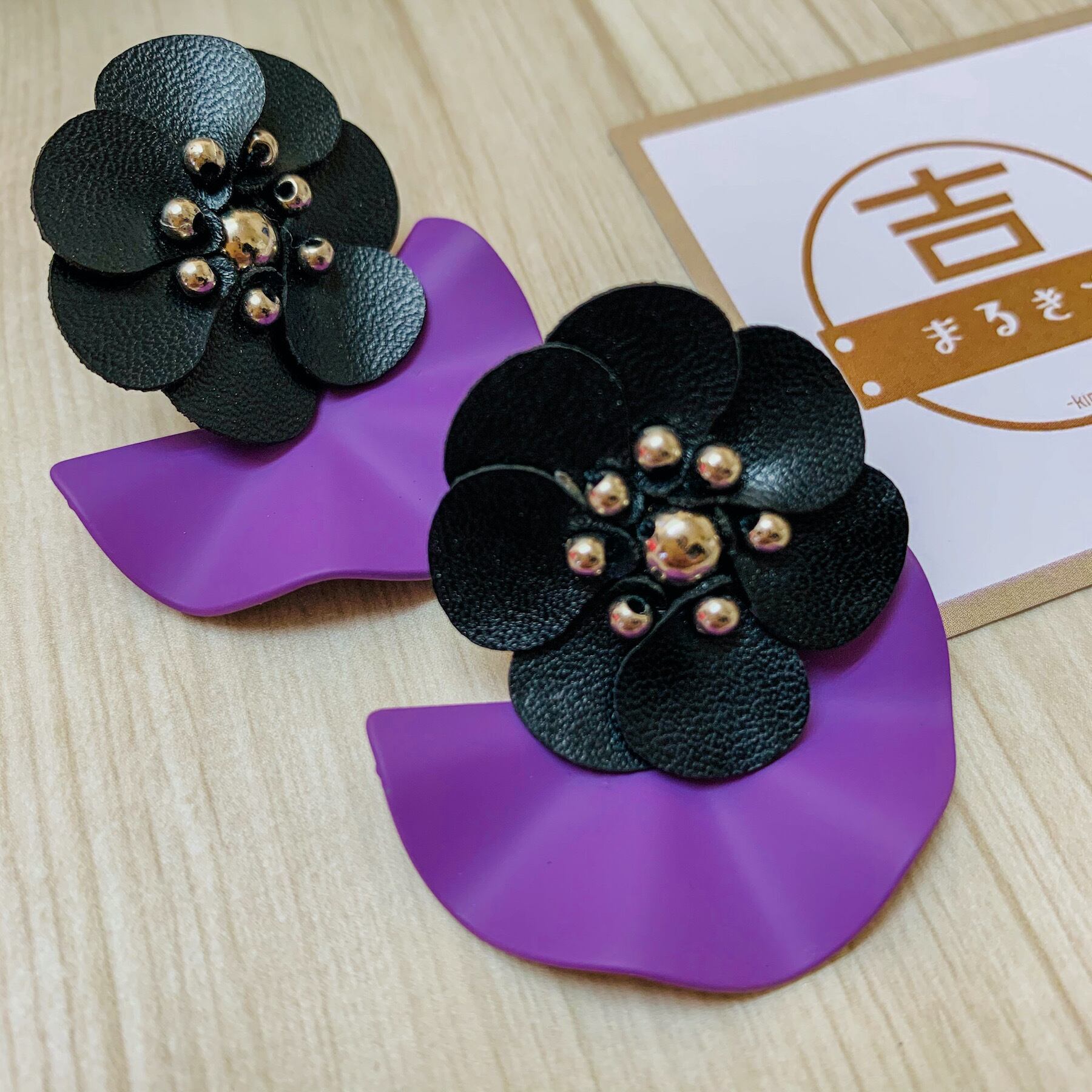 扇ピアス○扇型×花○大ぶり個性派ピアス○ブラック×パープル