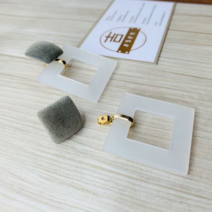 マットホワイトのスクエアパーツに、フロッキー スクエア グレー カボションの2wayピアスです。