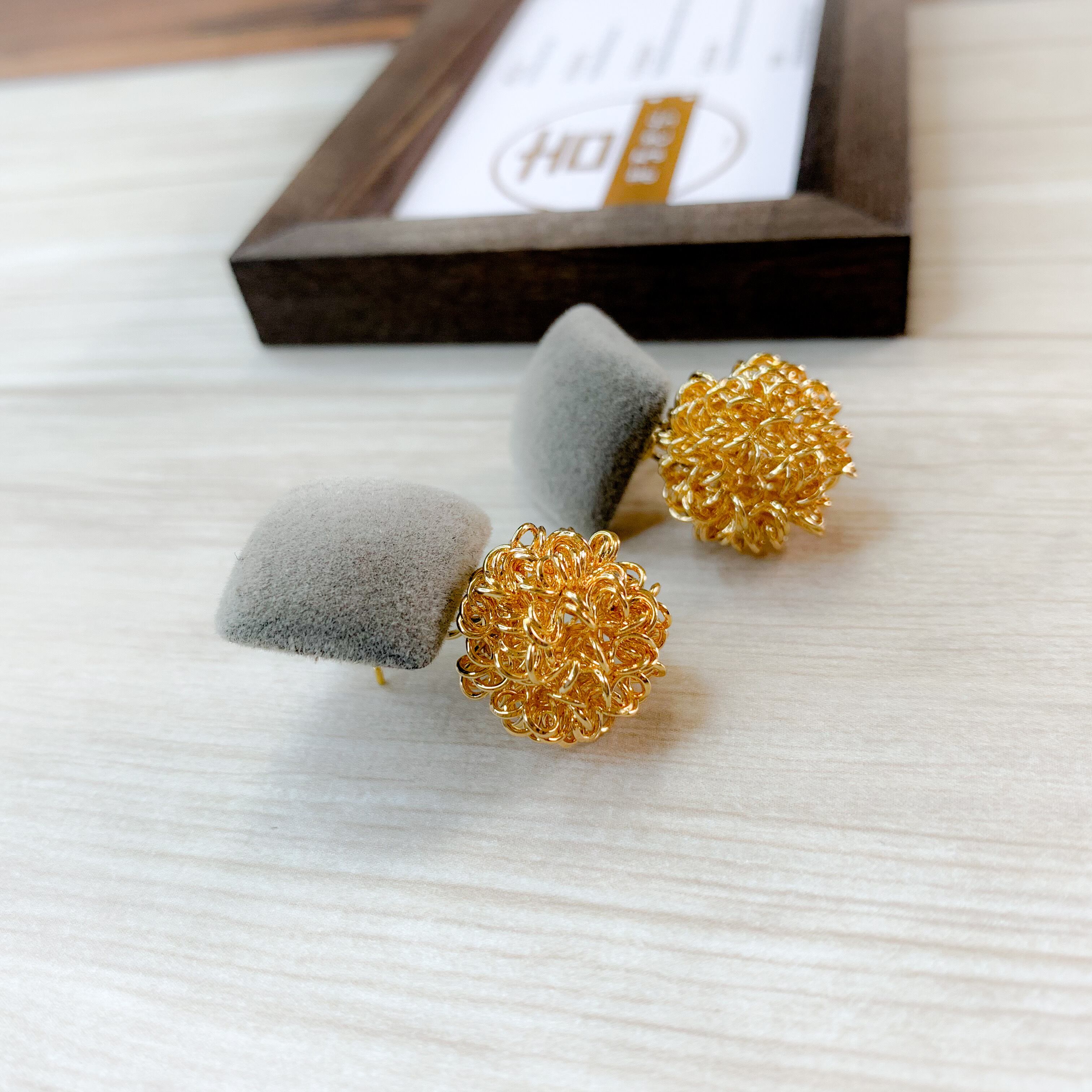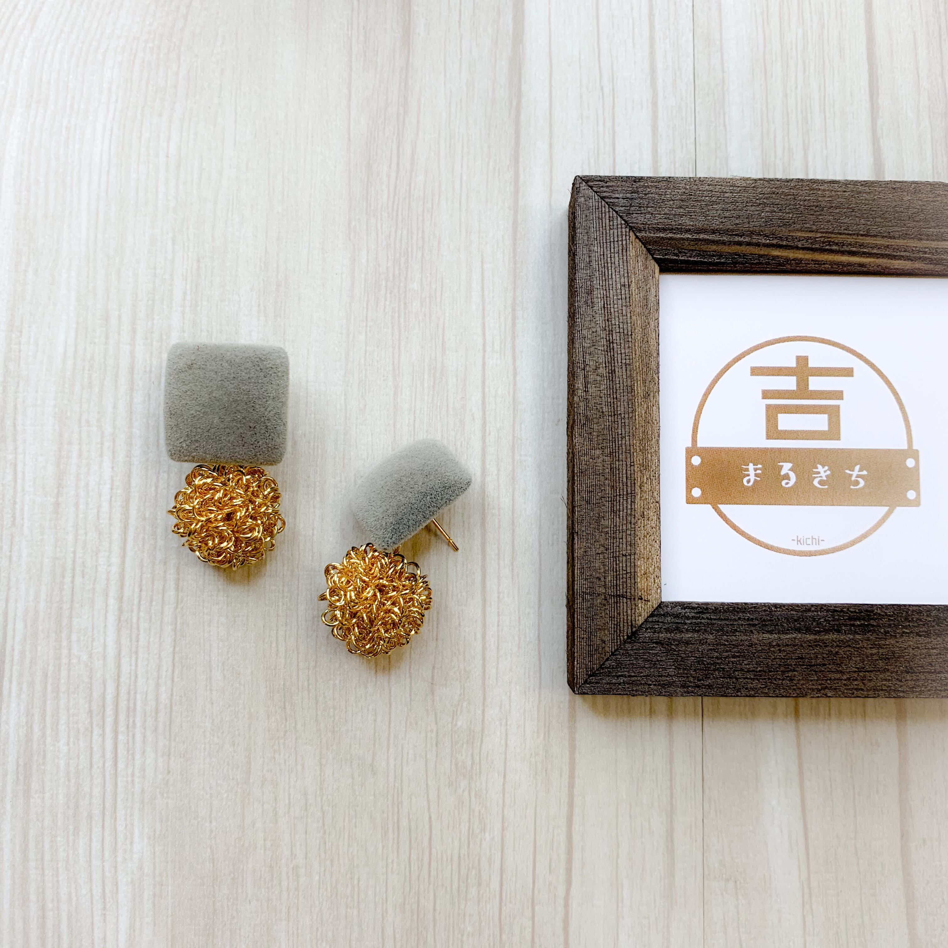 スクエアピアス○グレー×ゴールド○フロッキー×ワイヤーボール○2wayピアス