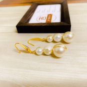 デザインフックからぶら下がる3連パールが揺れる大ぶりピアスです。