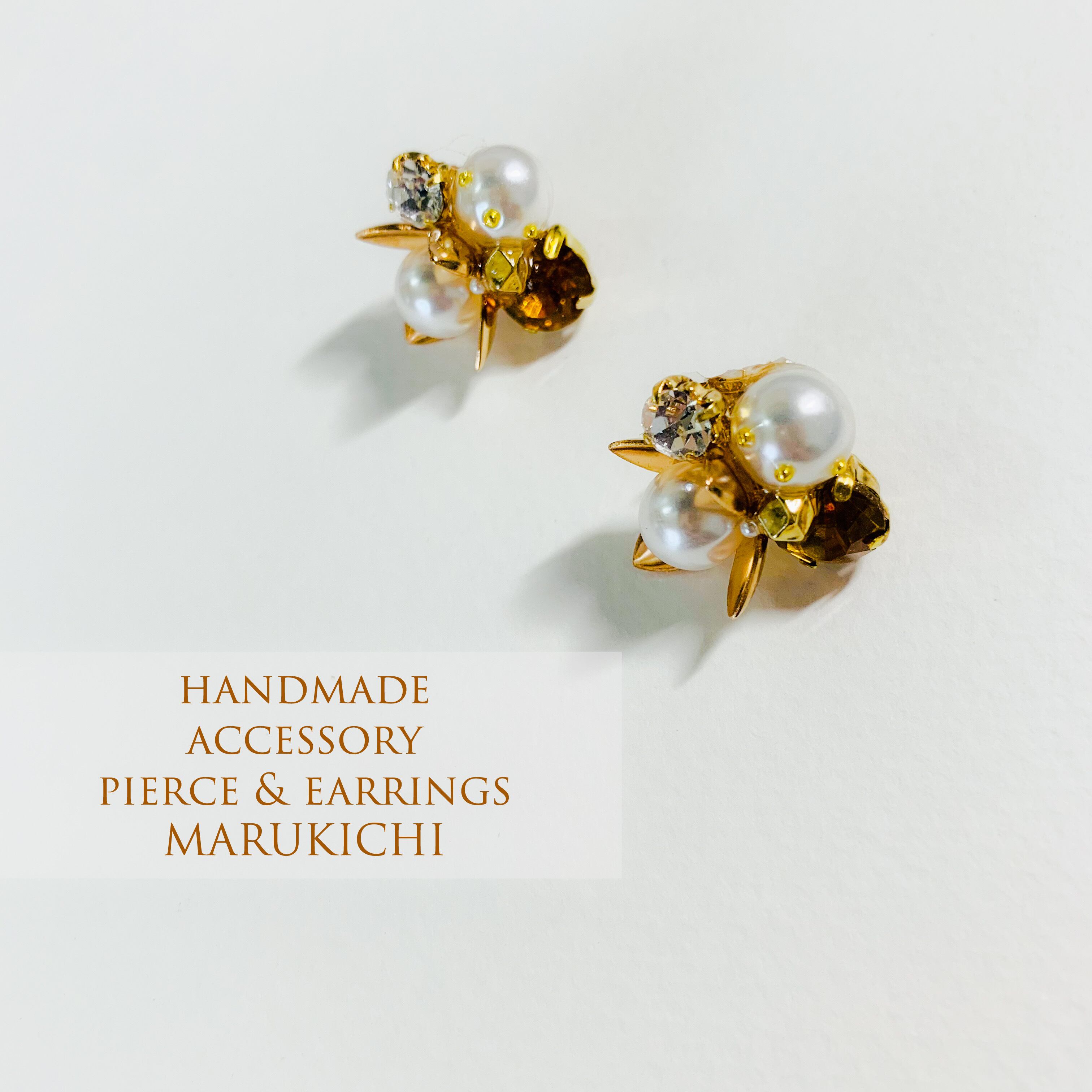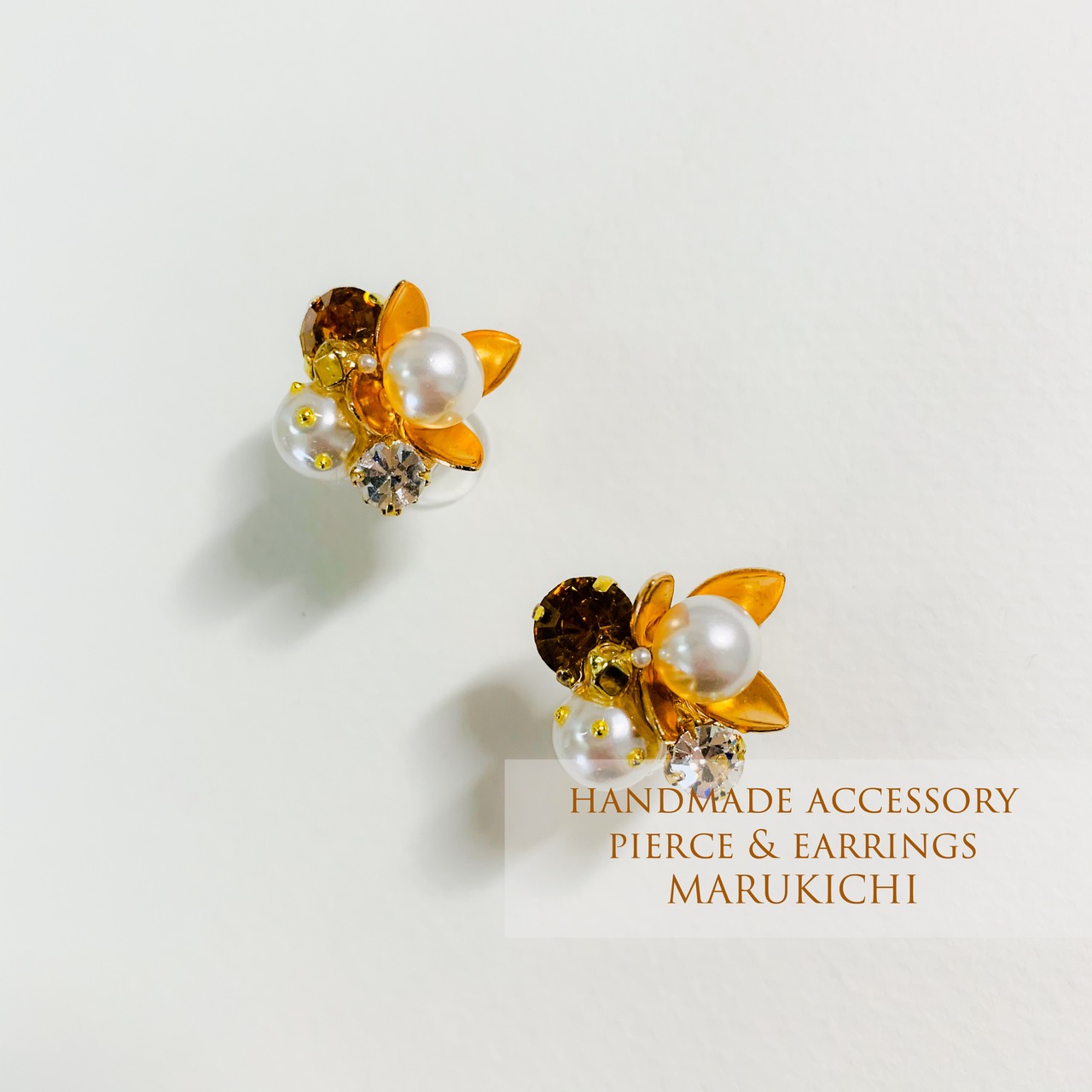 メタルフラワーにパールビーズ、ラインストーンのキラキラ華やかピアスです。