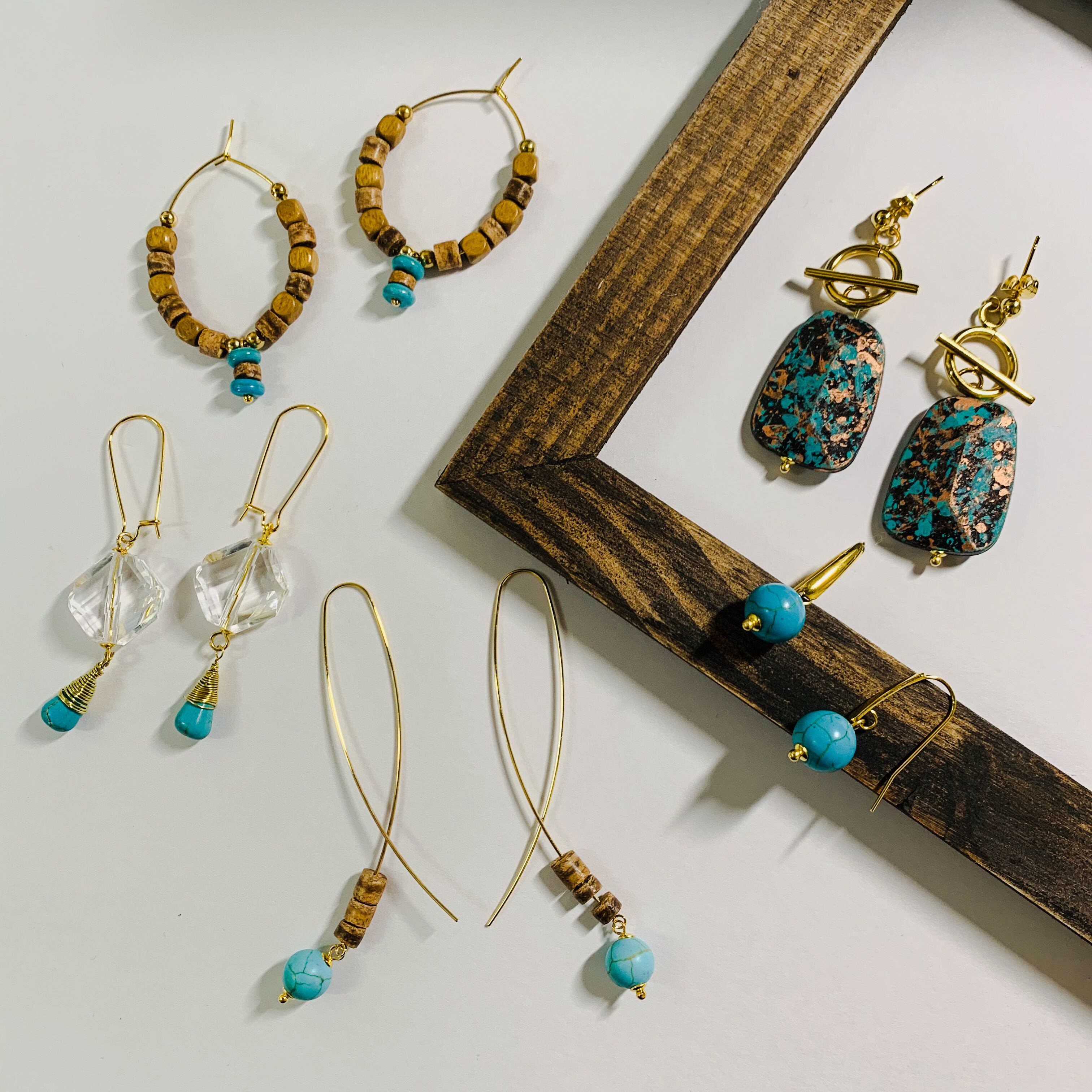 ターコイズピアス○クロスワイヤー×ターコイズカラー×ウッド○シンプルロングピアス