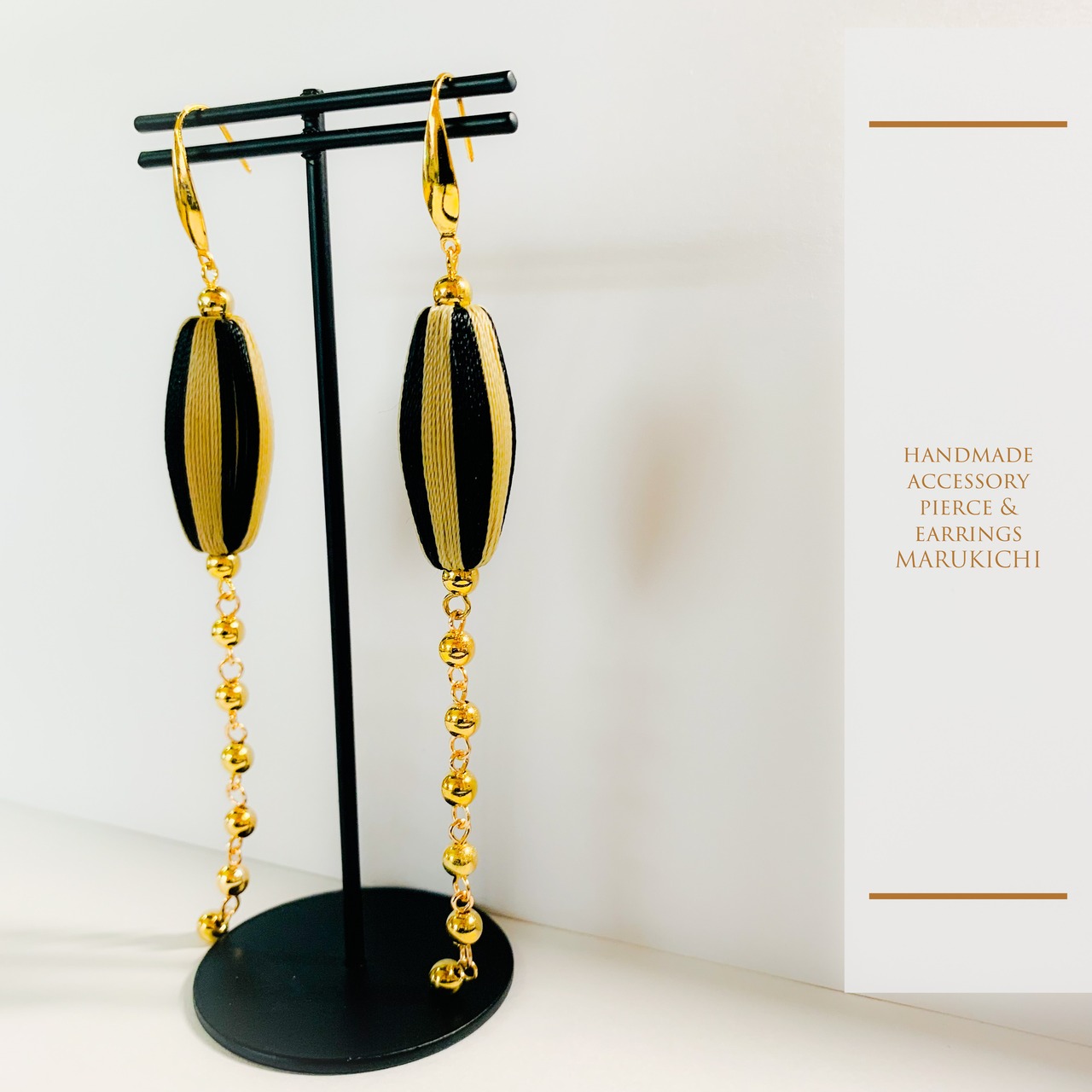 レトロな雰囲気の巻き玉とゴールドビーズが揺れるロングピアスです。